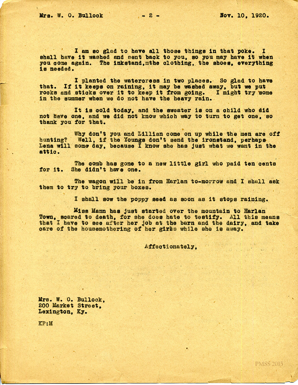 November 16, 1920. [unsigned] KP to “Min” (Mrs. W.O. Bullock), Lexington, KY. Thanks for items; met with reporters; Mrs. Zande and Mr. Manee in Harlan. [112]