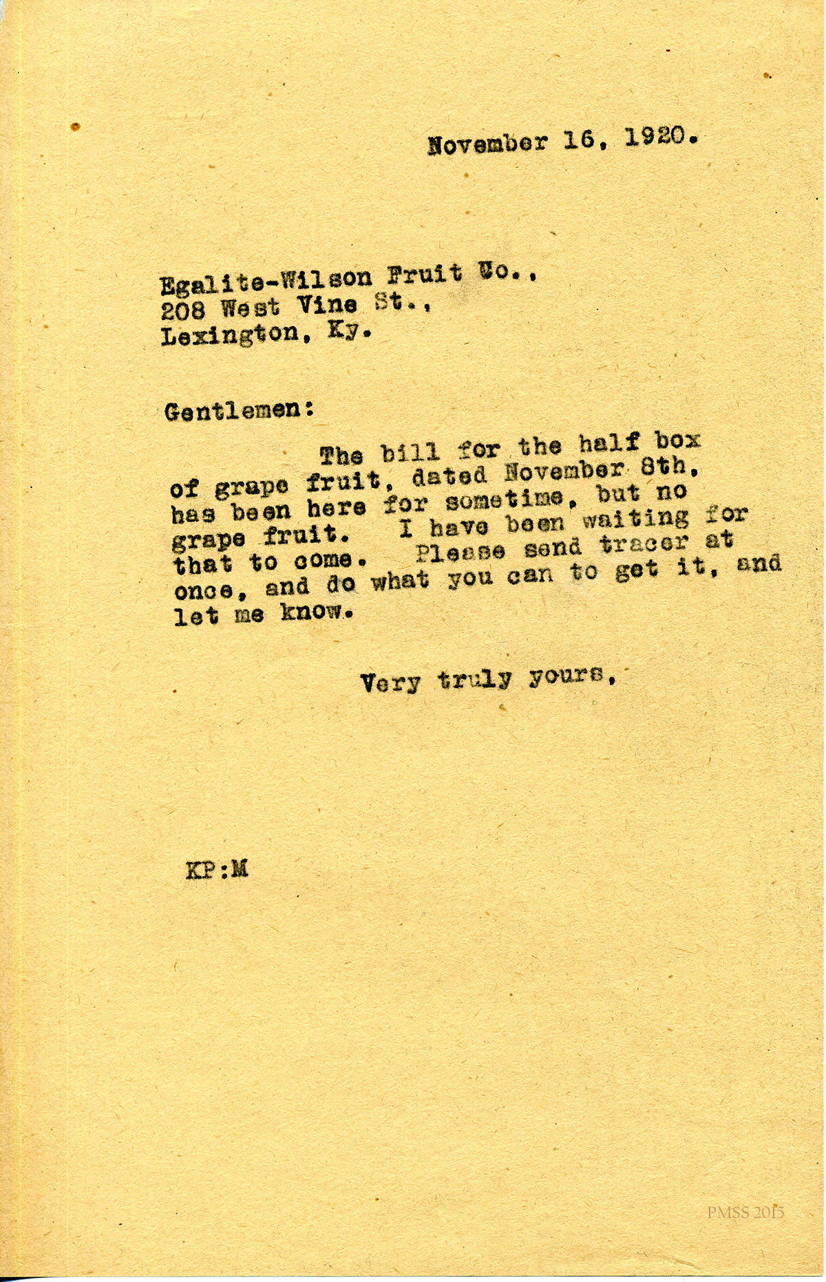 November 16, 1920. [unsigned] KP to “Gentlemen”, Egalite-Wilson Fruit Co, Lexington, KY. Waiting for grapefruit delivery before paying bill. [111]