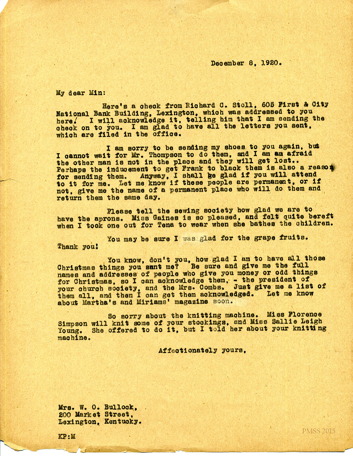 December 8, 1920. [unsigned] KP to “Min” (Mrs. W.O. Bullock), Lexington, KY. Thanks for gifts; Miss Florence Simpson; Miss Sallie Leigh Young to knit stockings. [114]