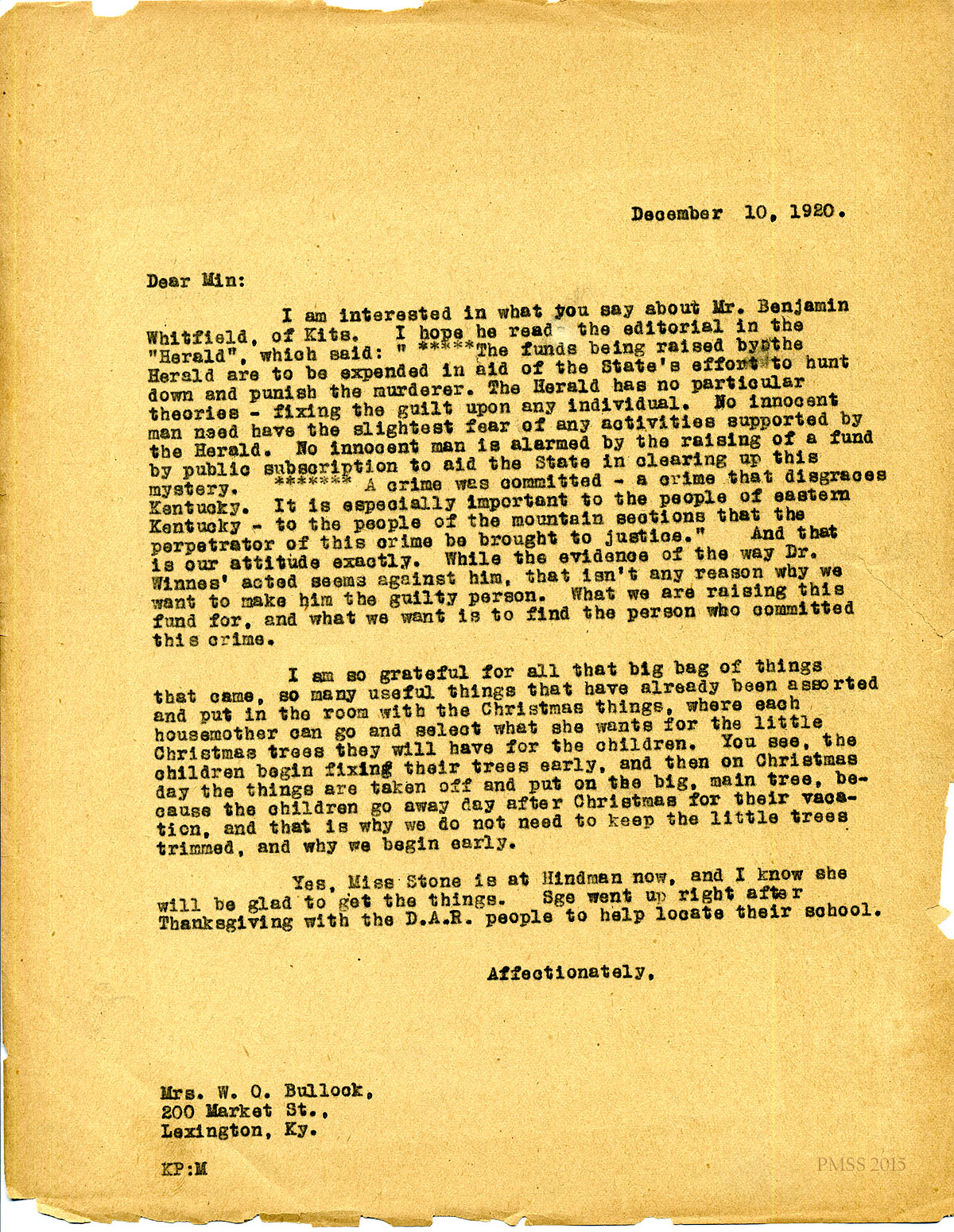 December 10, 1920. [unsigned] KP to “Min” (Mrs. W.O. Bullock), Lexington, KY. Quote from Herald about perpetrator of crime; Christmas tree tradition at PMSS. [115]