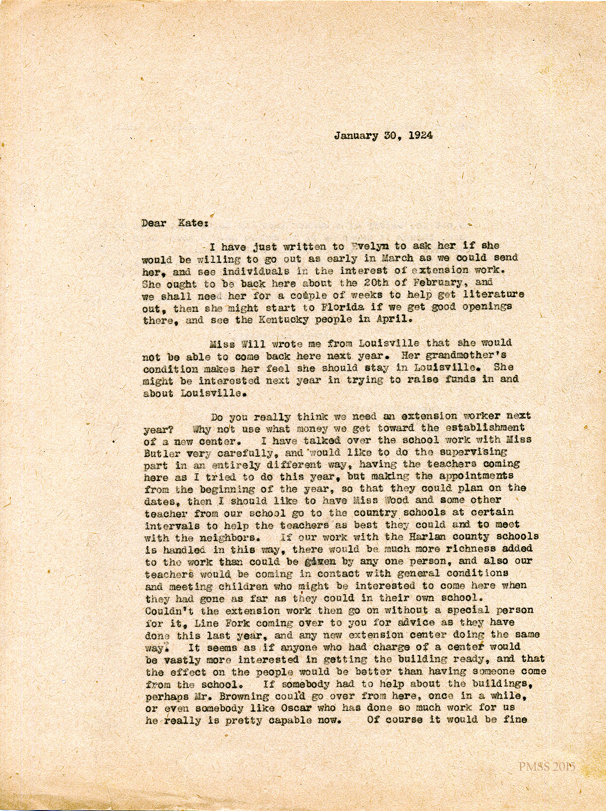 January 30, 1924. [unsigned] EZ to “Kate” (Katherine Pettit), Lexington, KY. Planning Evelyn’s fundraising visits; Miss Will; suggests changing the supervision of extension work and sending teachers to the country schools at intervals. [001-002]