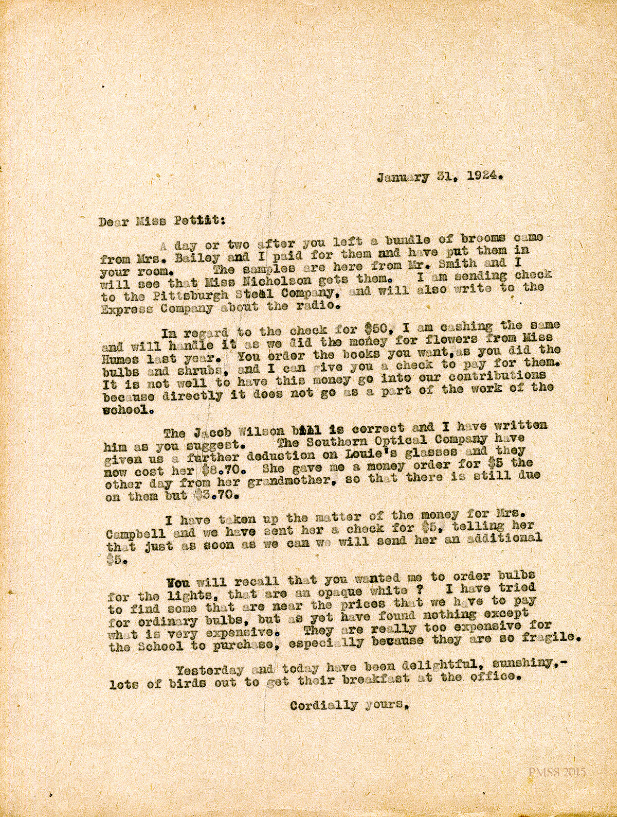 January 31, 1924. [unsigned] ? to Miss Pettit. Bill-paying; ordering supplies. [003]