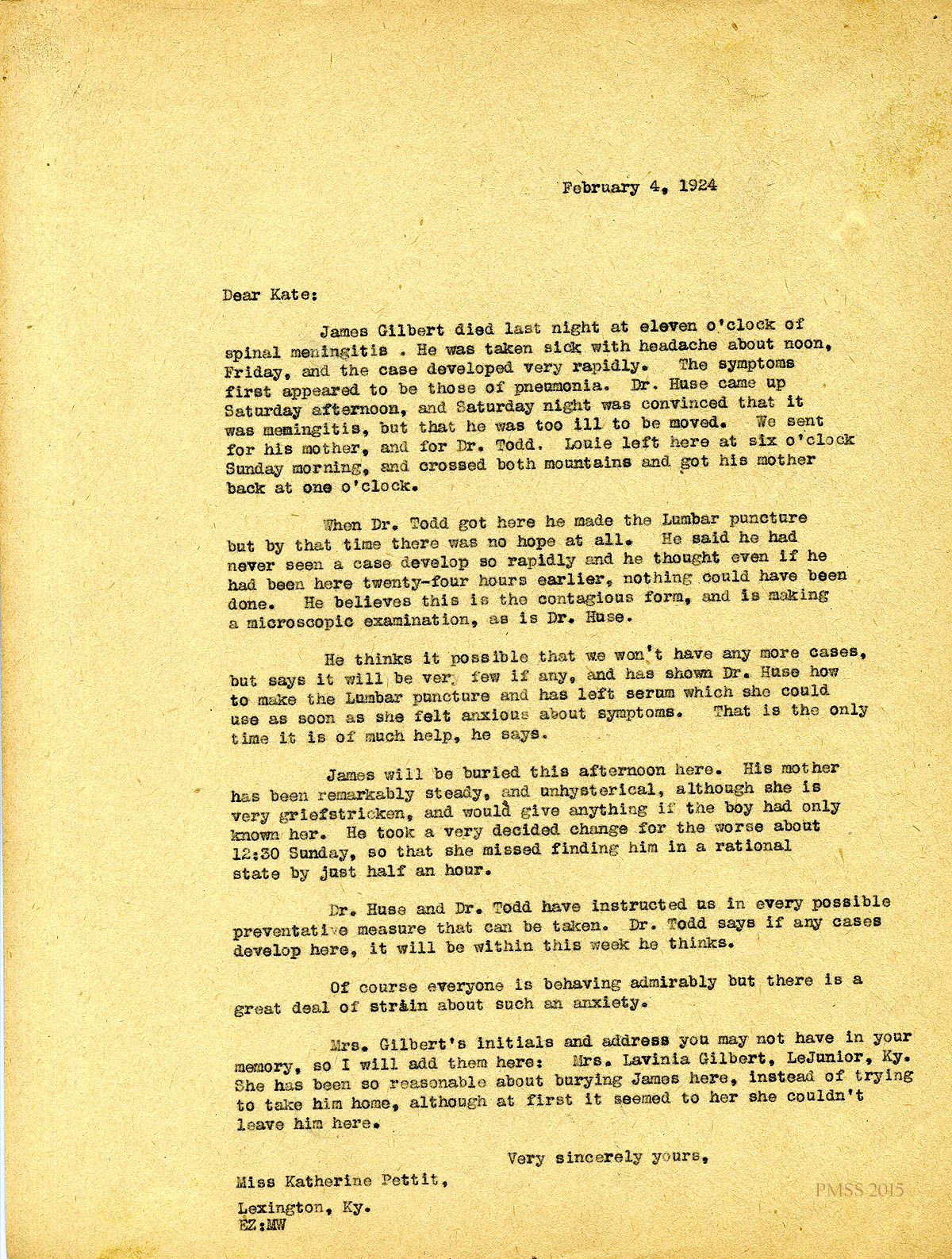 February 4, 1924. [unsigned] EZ to “Kate” (Katherine Pettit), Lexington, KY. James Gilbert died of spinal meningitis; Dr. Huse; Dr. Todd; Mrs. Lavinia Gilbert; burial. [004]