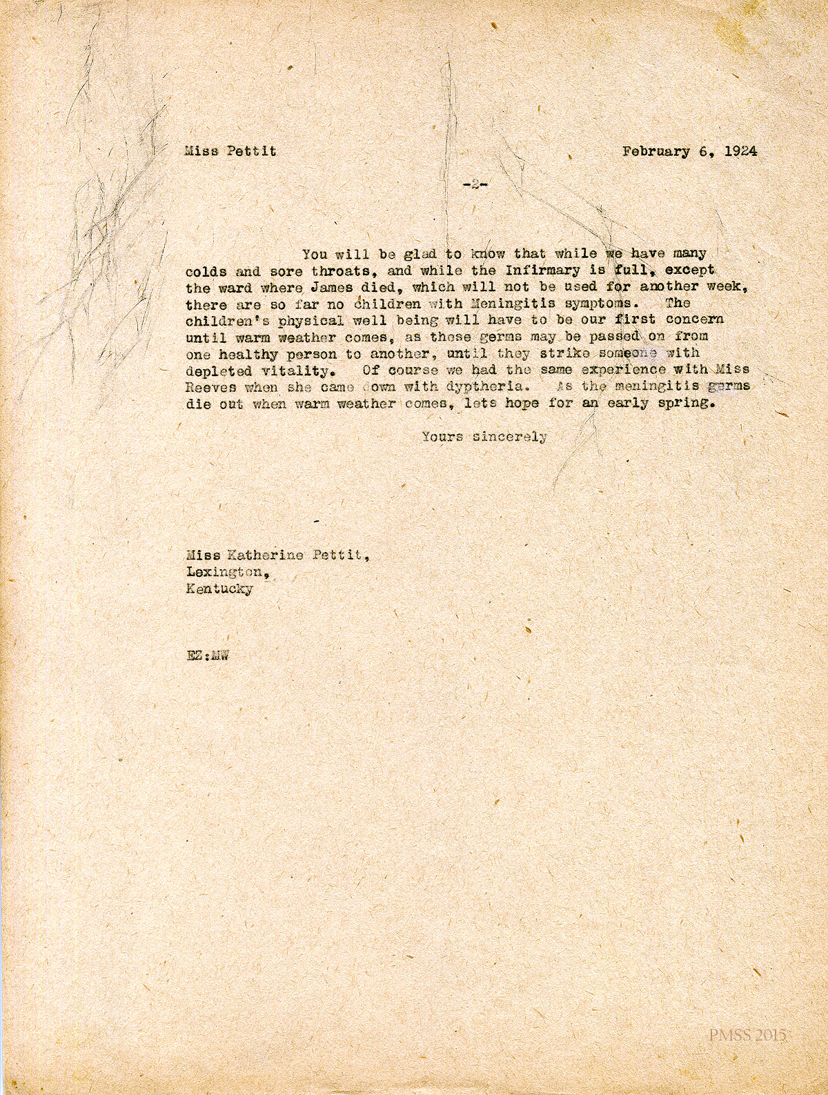February 6, 1924. [Page 1 is missing; this is page 2.] [unsigned] EZ to Katherine Pettit, Lexington, KY. No other meningitis symptoms yet; Miss Reeves’ diphtheria. [005]