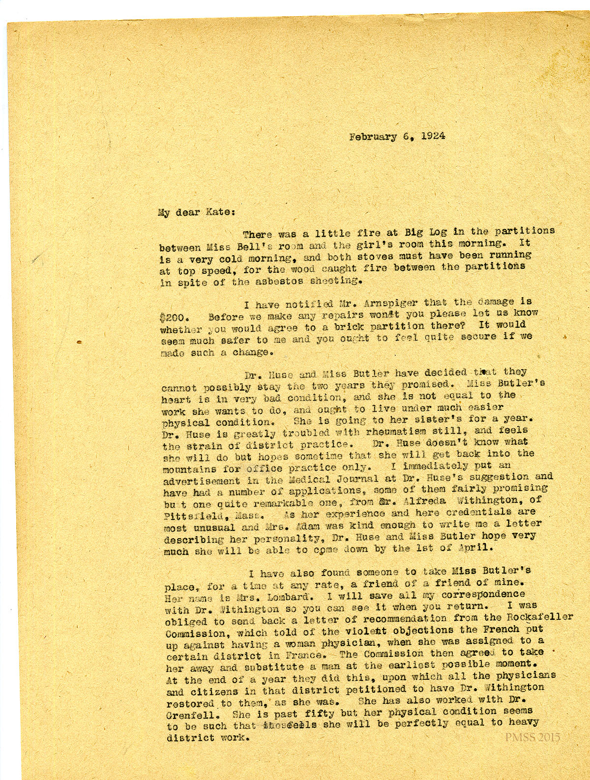 February 6, 1924. ? to “Kate” (Katherine Pettit). Small fire at Big Log; notified Mr. Arnspiger of $200 damage; Due to health problems Miss Butler and Dr. Huse are resigning; possible replacements are Dr. Alfreda Withington and Mrs. Lombard. [006] [Next page is missing.]