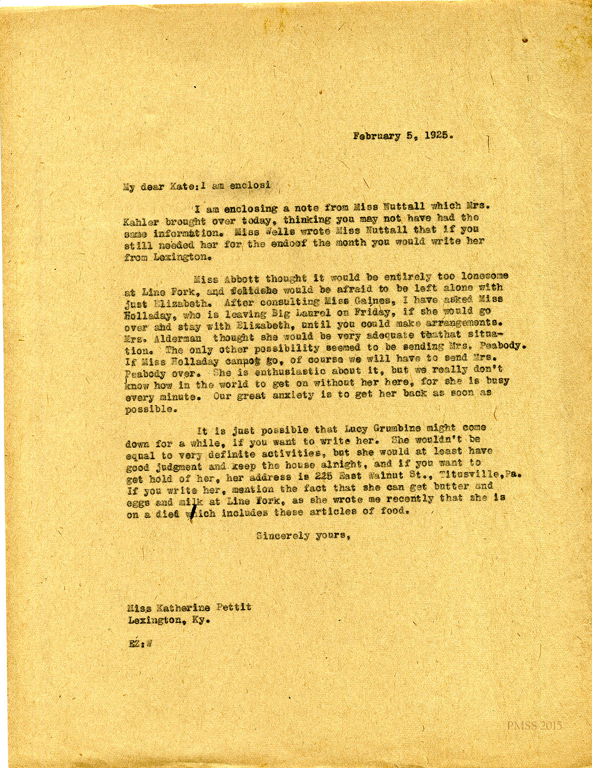February 5, 1925. [unsigned] EZ to “Kate” (Katherine Pettit), Lexington, KY. Managing Line Fork workers. [001]
