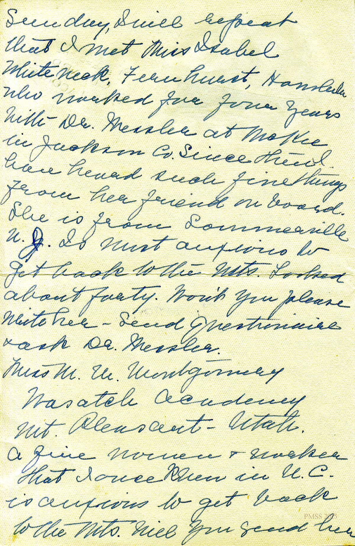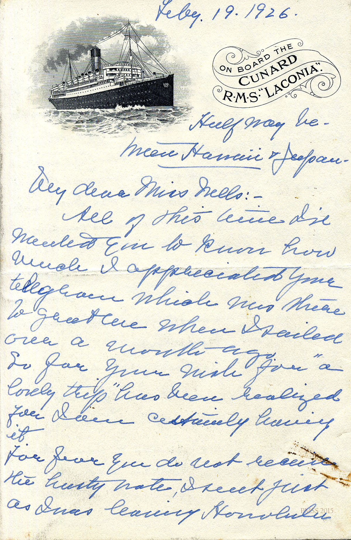 February 19, 1926. K. Pettit to Miss [Evelyn] Wells. [Handwritten] Letterhead: “On Board the Cunard R.M.S. Laconia.” Halfway between Hawaii and Japan; Asks Wells to send application to Miss. W. U. Montgomery; experiences in Hawaii. [001-004]