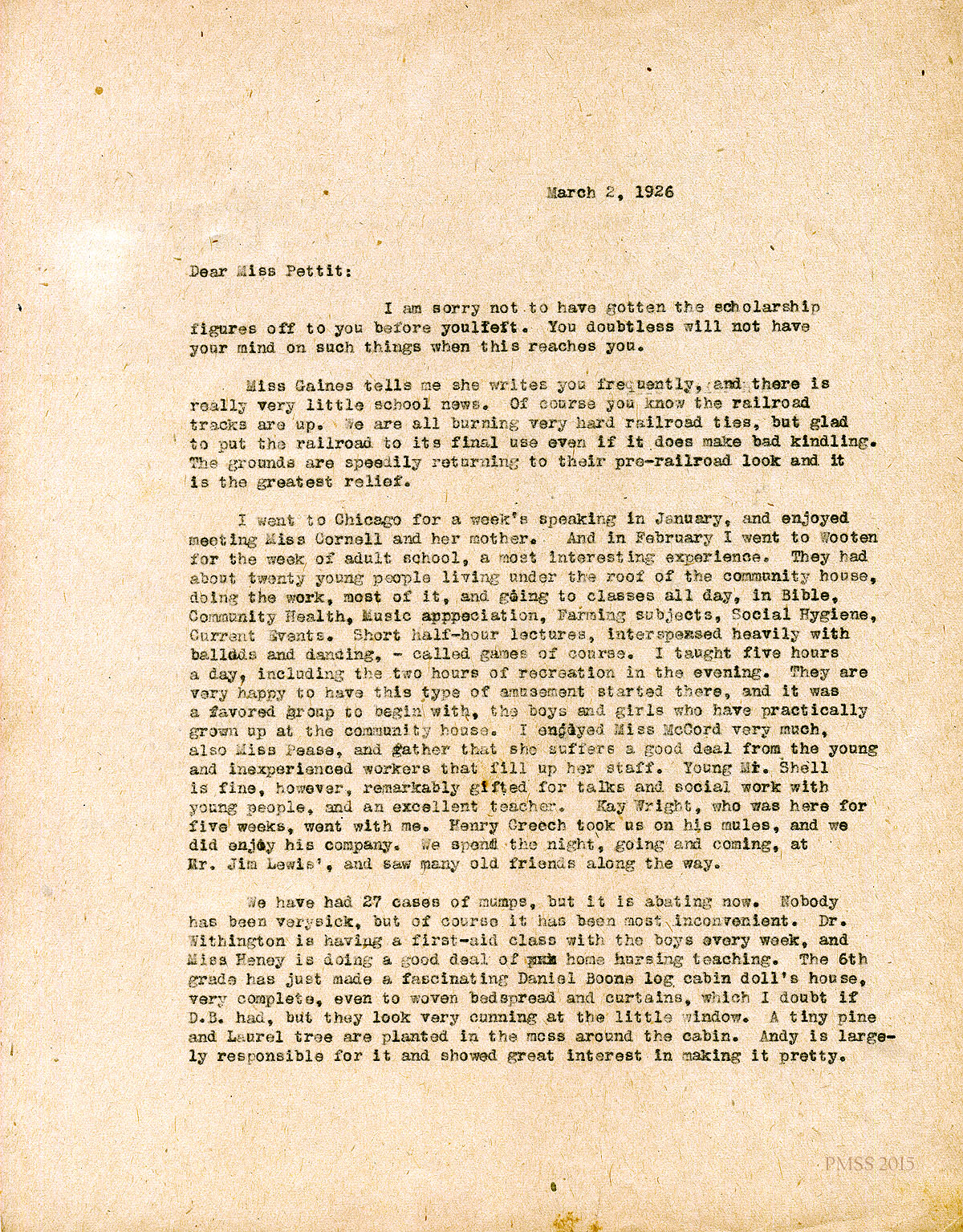 March 2, 1926. [unsigned] ? to Miss Pettit. Removal of railroad tracks; adult school in Wooten; mumps; Dr. Withington; miniature log cabin;Notes; addressograph. [005-006]