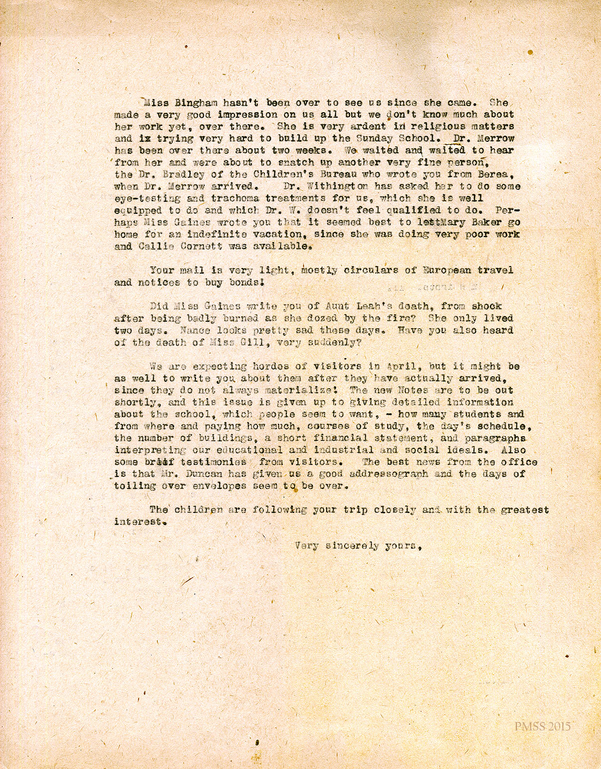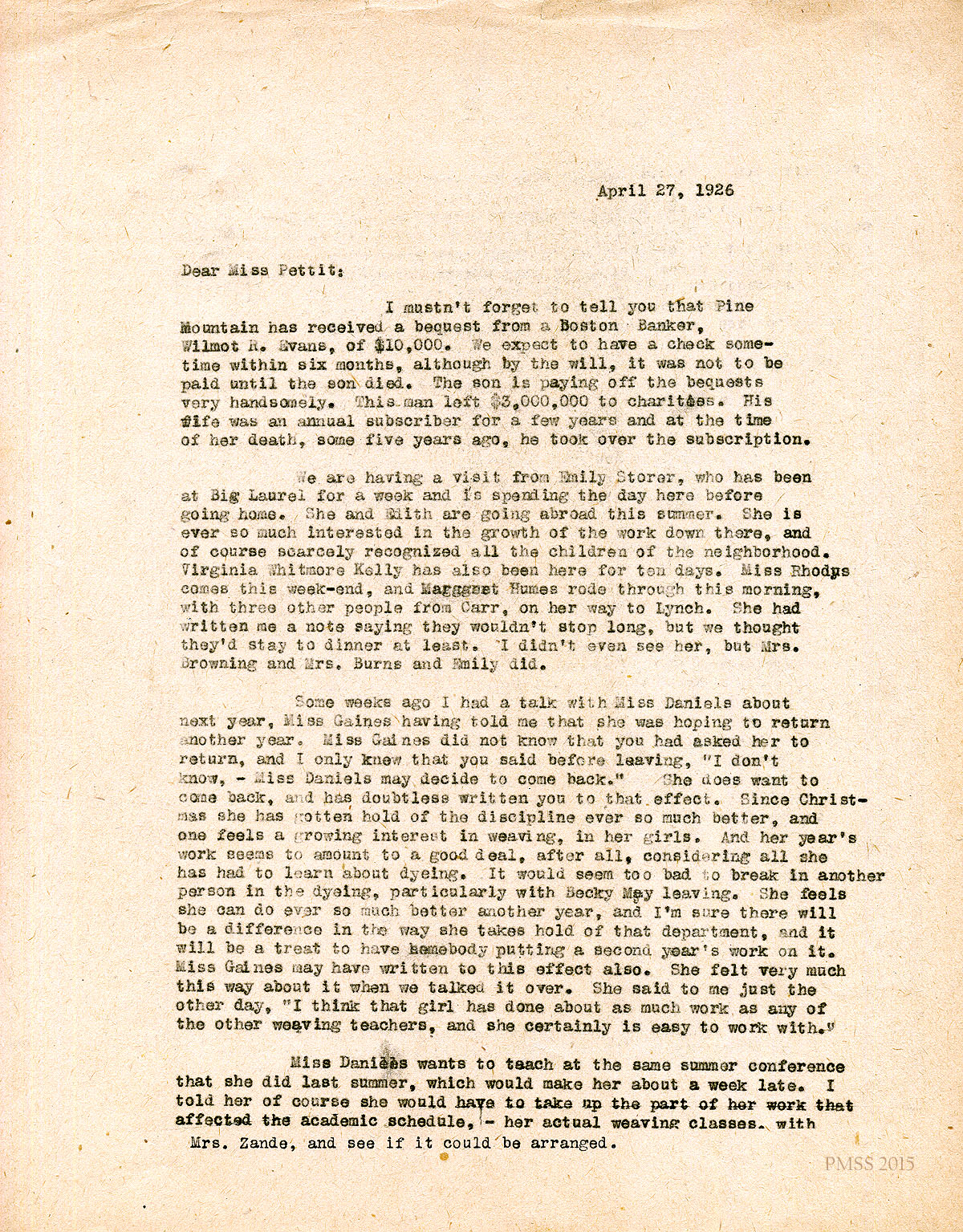 April 27, 1926. [unsigned] ? to Miss Pettit. Bequest from Wilmot R. Evans; visitors; re-hiring Miss Daniels, weaving teacher; Miss Gaines’ train accident. [009-010]
