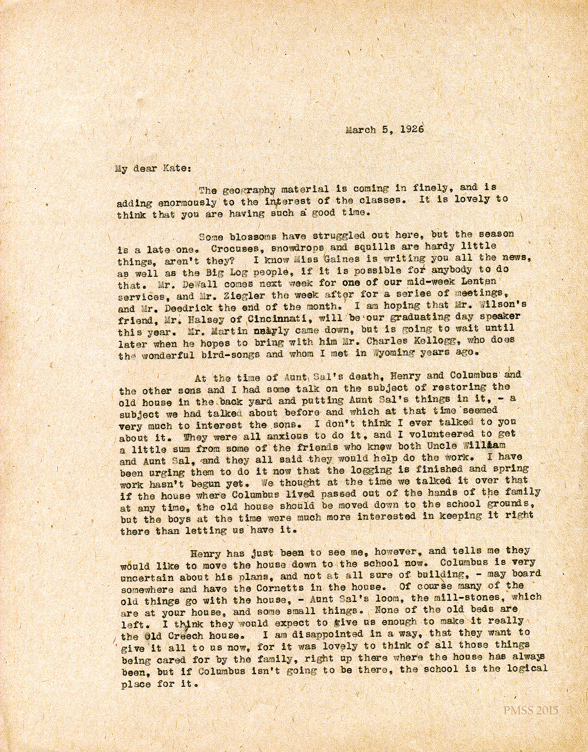 March 5, 1926. [unsigned] ? to “Kate” (K. Pettit). Visitors; Creech boys; plans for restoring Aunt Sal’s house; moving it to P.M.; possible sites. [007-008]