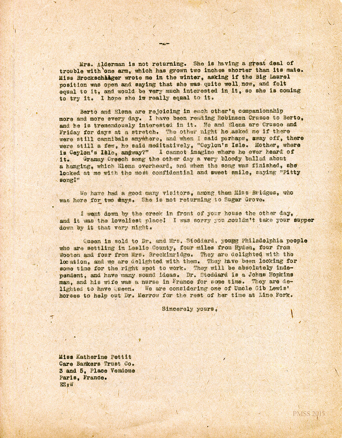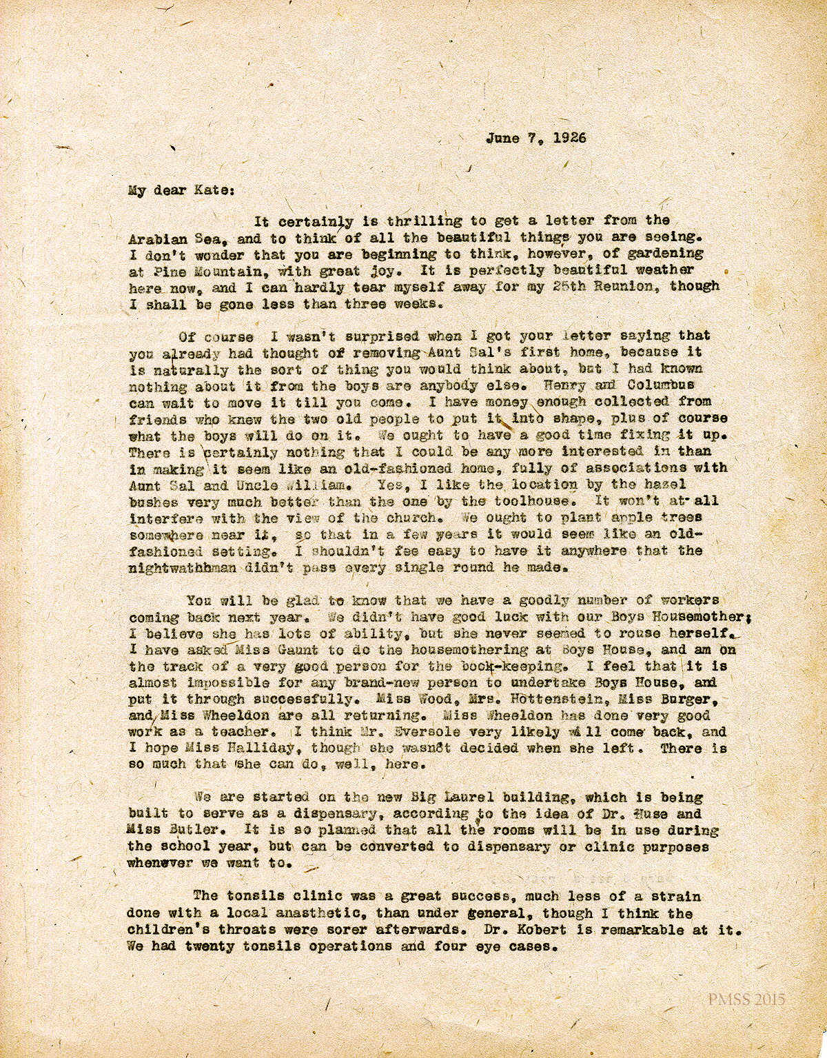 June 7, 1926. [unsigned] EZ to “Kate” (K. Pettit), Paris, France. Relocating Aunt Sal’s house; workers staying and leaving; started Big Laurel building; Berto and Elena [Zande]; Dr. and Mrs. Stoddard. [011-012]