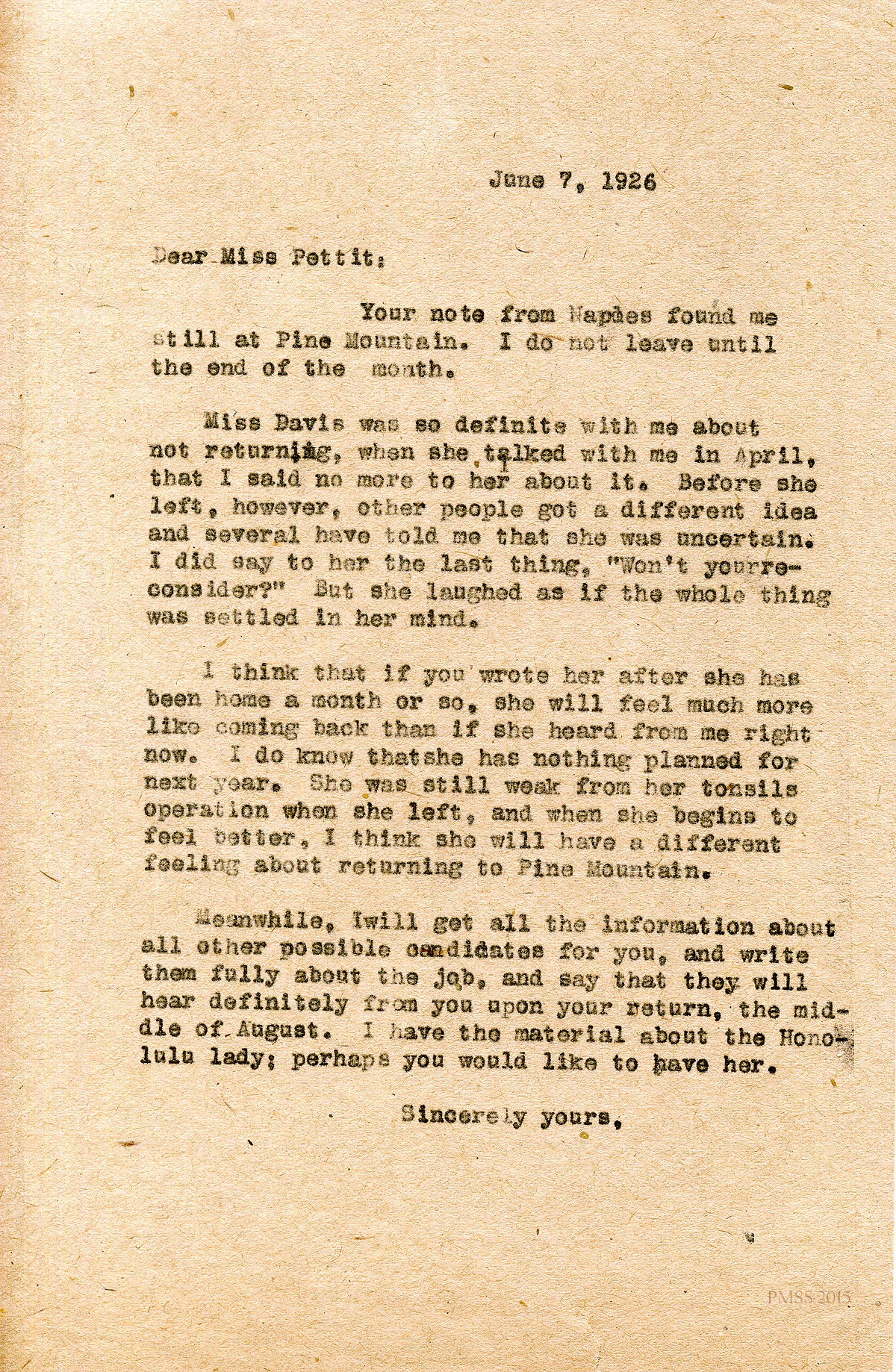 June 7, 1926. [unsigned] ? to Miss Pettit. Persuading Miss [Rachel H.] Davis to return. [013]