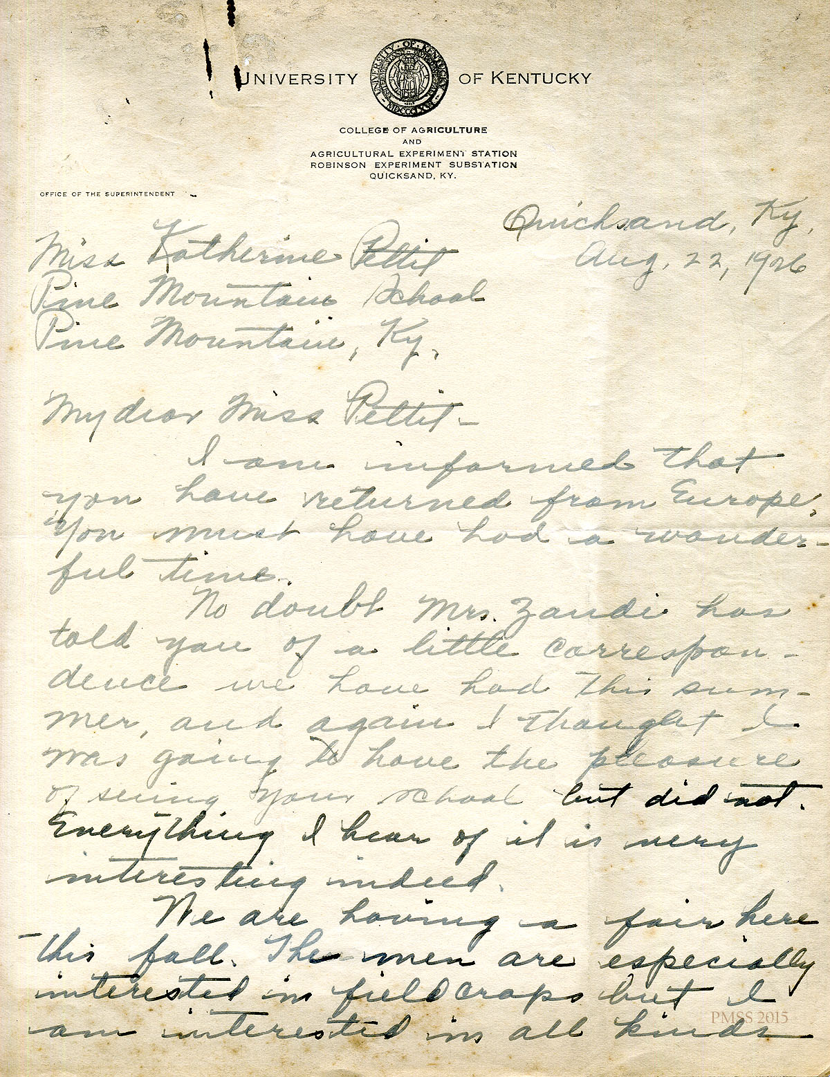 August 22, 1926. [Handwritten; likely from Lula M. Hale], Quicksand, KY, to Miss Pettit, Pine Mt. Letterhead: University of Kentucky College of Agriculture. Has been writing Mrs. Zande; her interests. [Second page is missing.] [014]