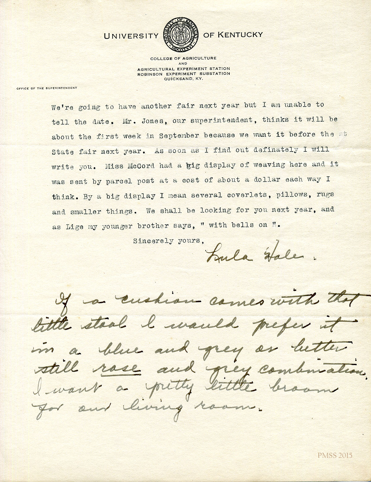 August 31, 1926. [Handwritten.] Lula M. Hale, University of KY College of Agriculture [letterhead], to Miss Pettit. KP’s handiwork at festival; Mallie. [015]