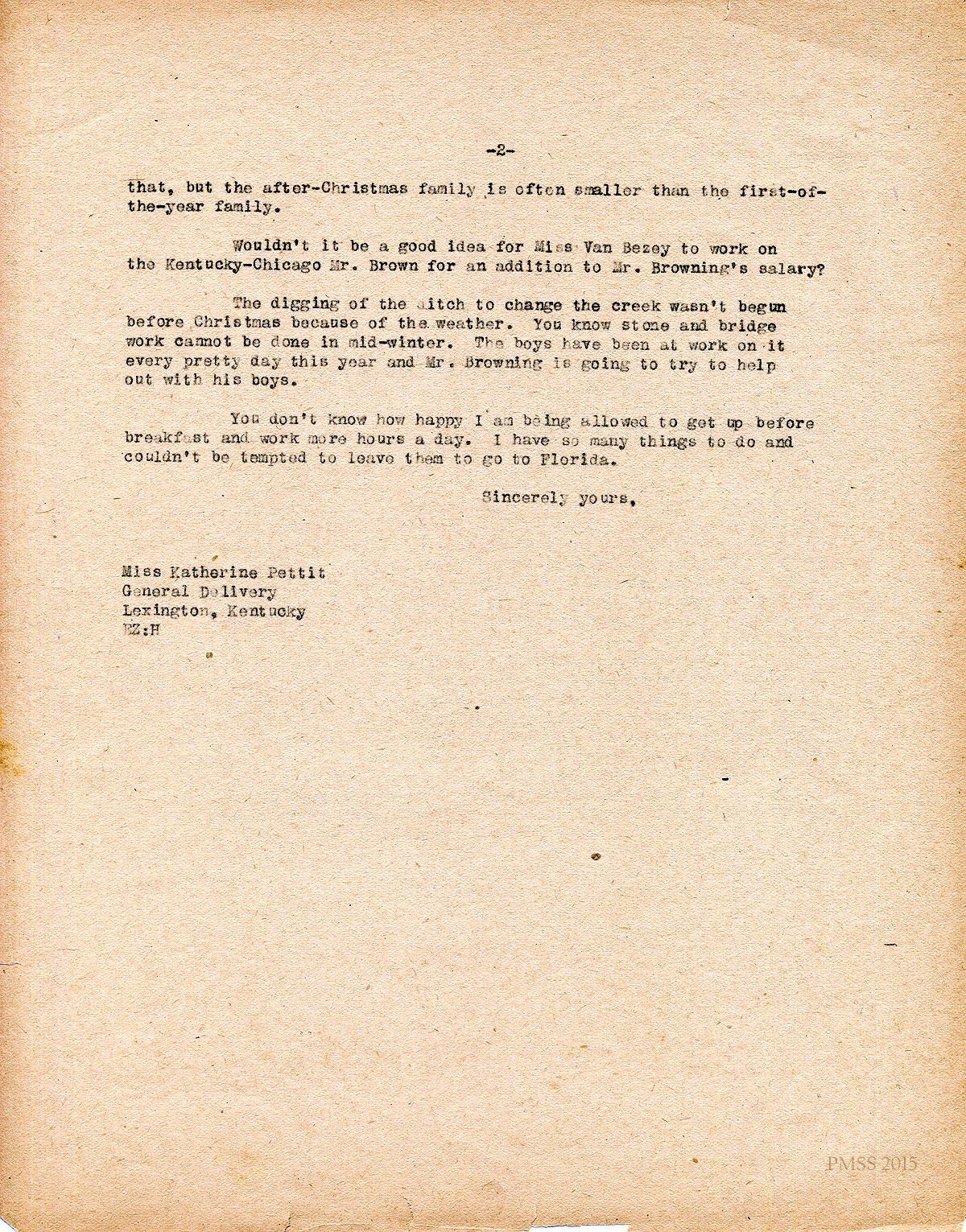 February 4, 1927. [unsigned]. EZ [Ethel Zande] to “Kate” [Katherine Pettit], Lexington, KY. Explains why she prefers using Farm House for Mr. & Mrs. Browning instead of building a new house for them; suggests using student labor to build a new dormitory, remodel Infirmary, add a room to Model Home ; re-aligning the creek. [006-007]