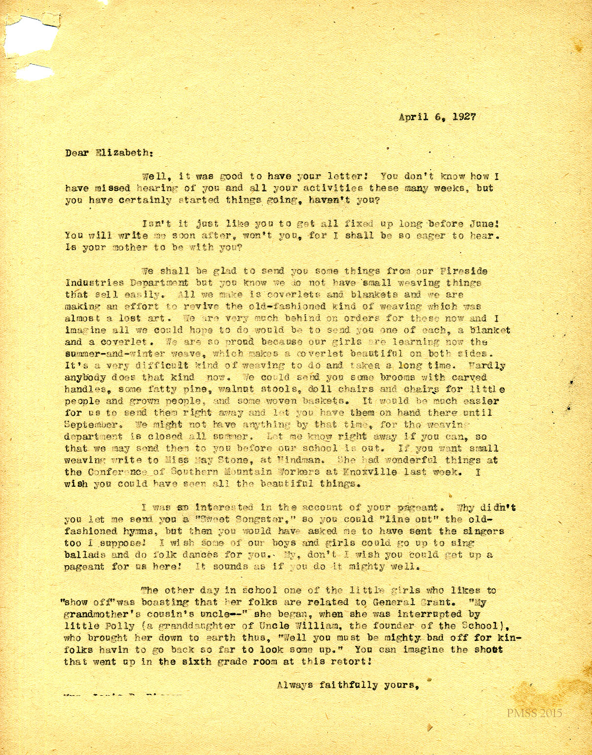 April 6, 1927. [unsigned, truncated] ? to “Elizabeth”. Agreed to send coverlet and blanket made by the Fireside Industries Dept; describes weaving ; lists other items she can send; refers her to Miss May Stone, Hindman ; pageant ; anecdote. [010]