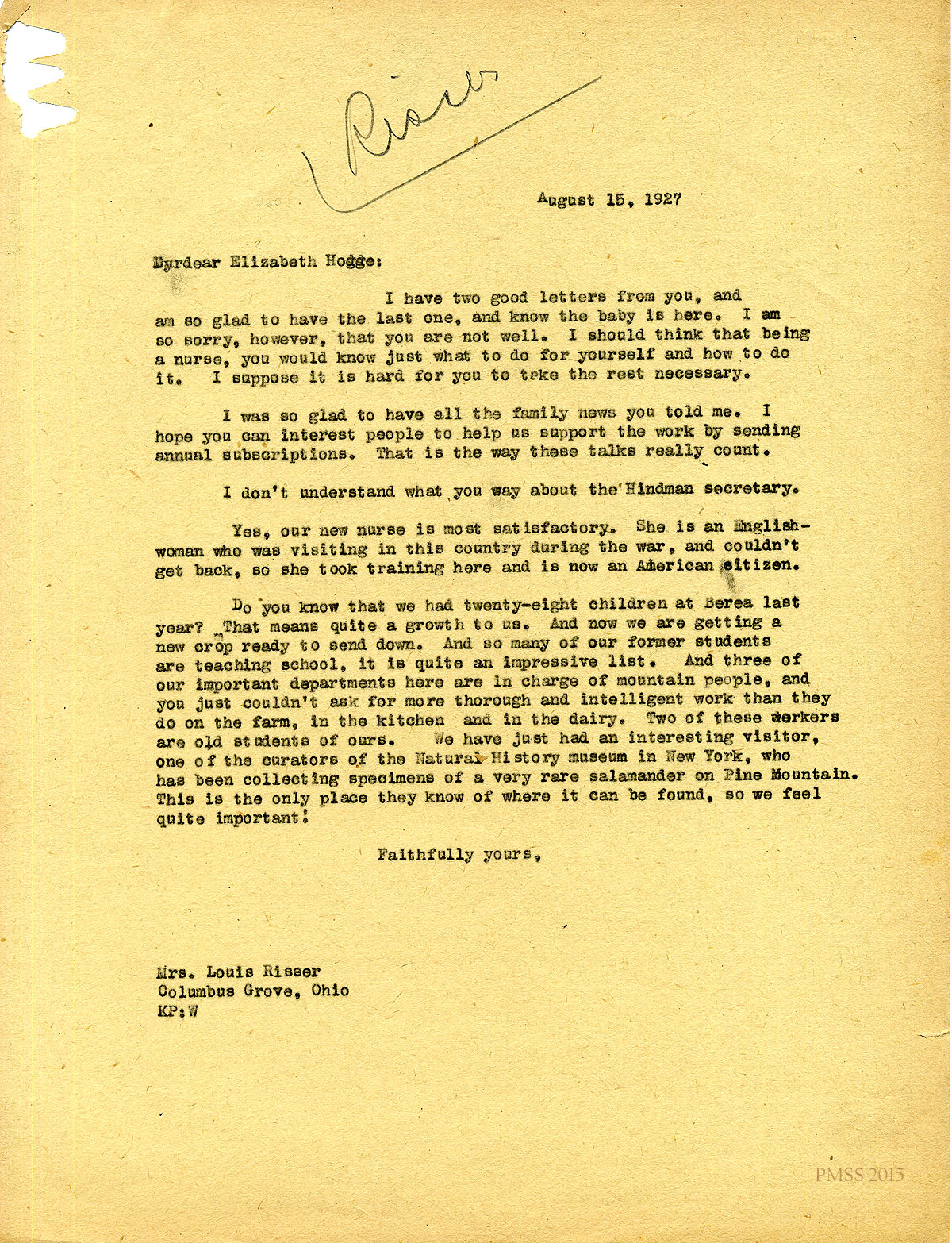 August 15, 1927. [unsigned] KP to “Elizabeth Hodge”, (Mrs. Louis D. Risser), Columbus Grove, OH. Hopes she can interest people in sending annual subscriptions; new English nurse; 28 P.M. students at Berea last year; other P.M. accomplishments; visit by curators from NY Natural History Museum to collect rare salamander. [012]