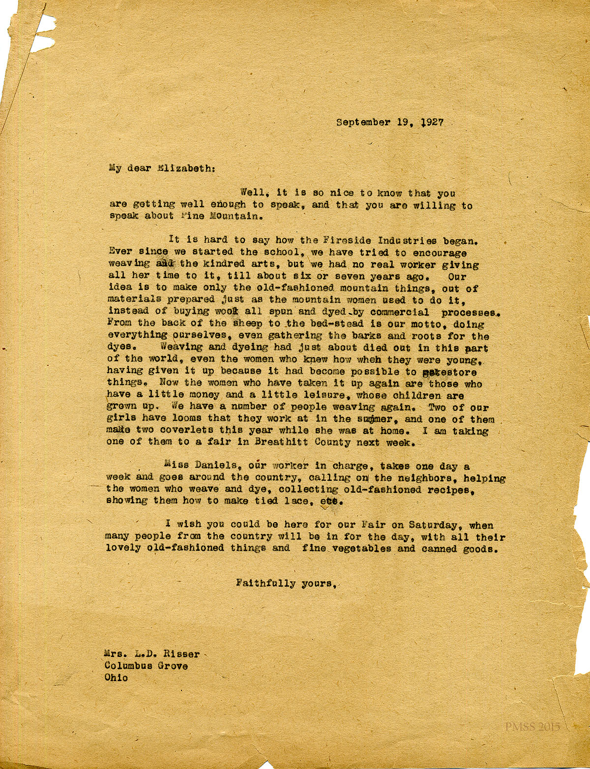 September 19 1927. [unsigned] ? to “Elizabeth” (Mrs. Louis D. Risser), Columbus Grove, OH. Glad Elizabeth is well enough give PMSS speeches; explain origins and policies of Fireside Industries; weaving and dyeing, managed by Miss Daniels. [013]