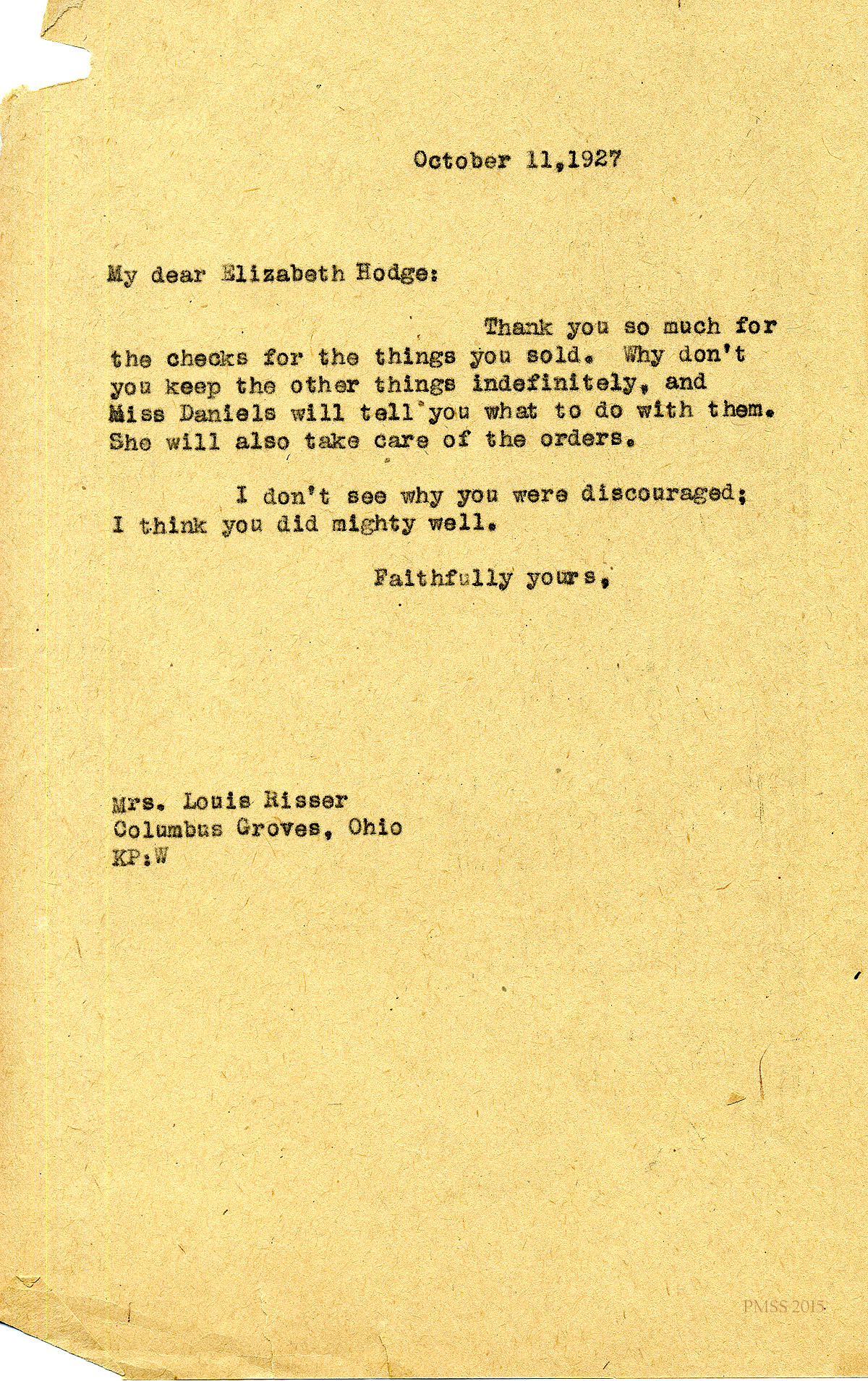 May 2, 1927. [unsigned, half-page] KP to “Elizabeth” (Mrs. Louis D. Risser), Columbus Grove, OH. Assures her that P.M. items will “get sold in the course of time”. [011]
