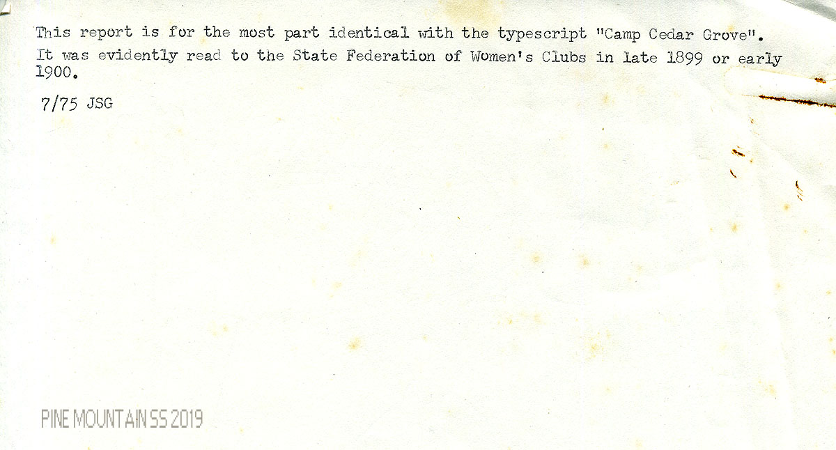 [000] The [handwritten] report is for the most part identical with the typescript “Camp Cedar Grove.” It was evidently read to the State Federation of Women’s Clubs in late 1899 or early 1900. 7/75 JSG (Dr. James S. Greene III)