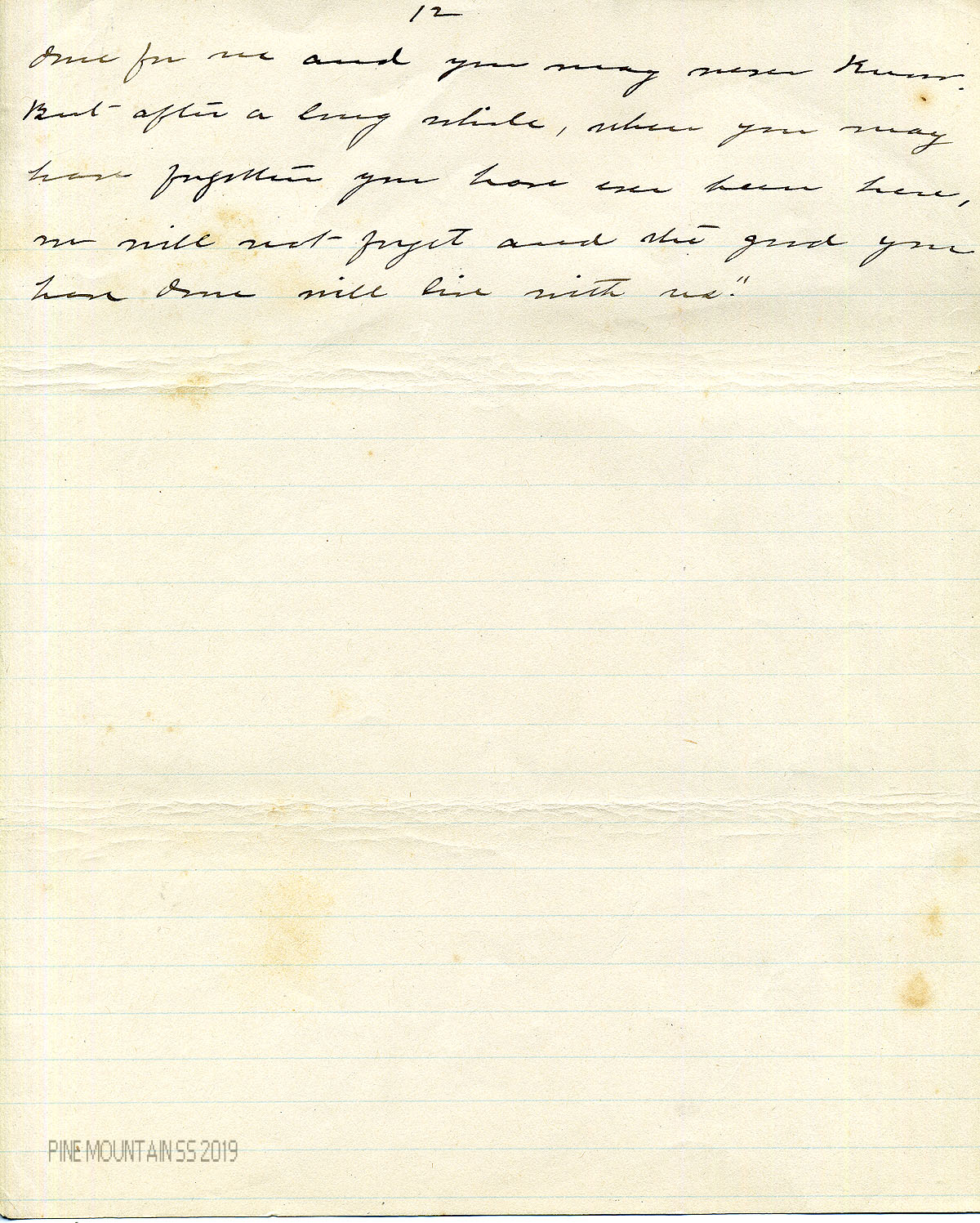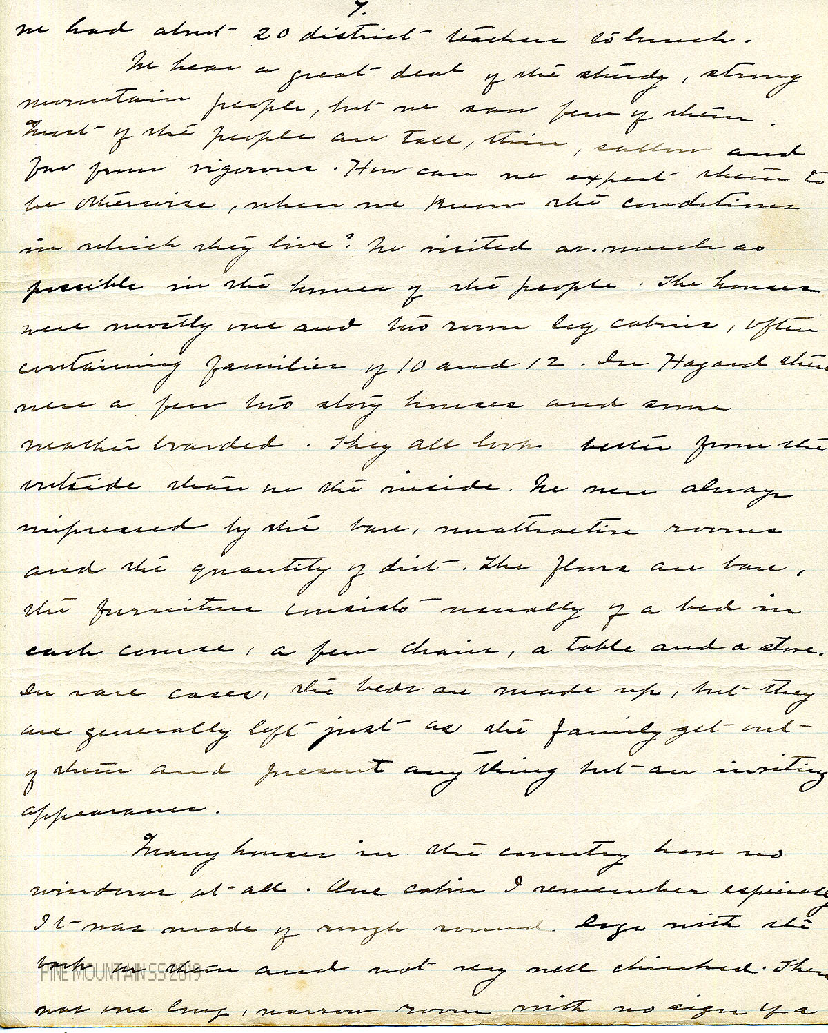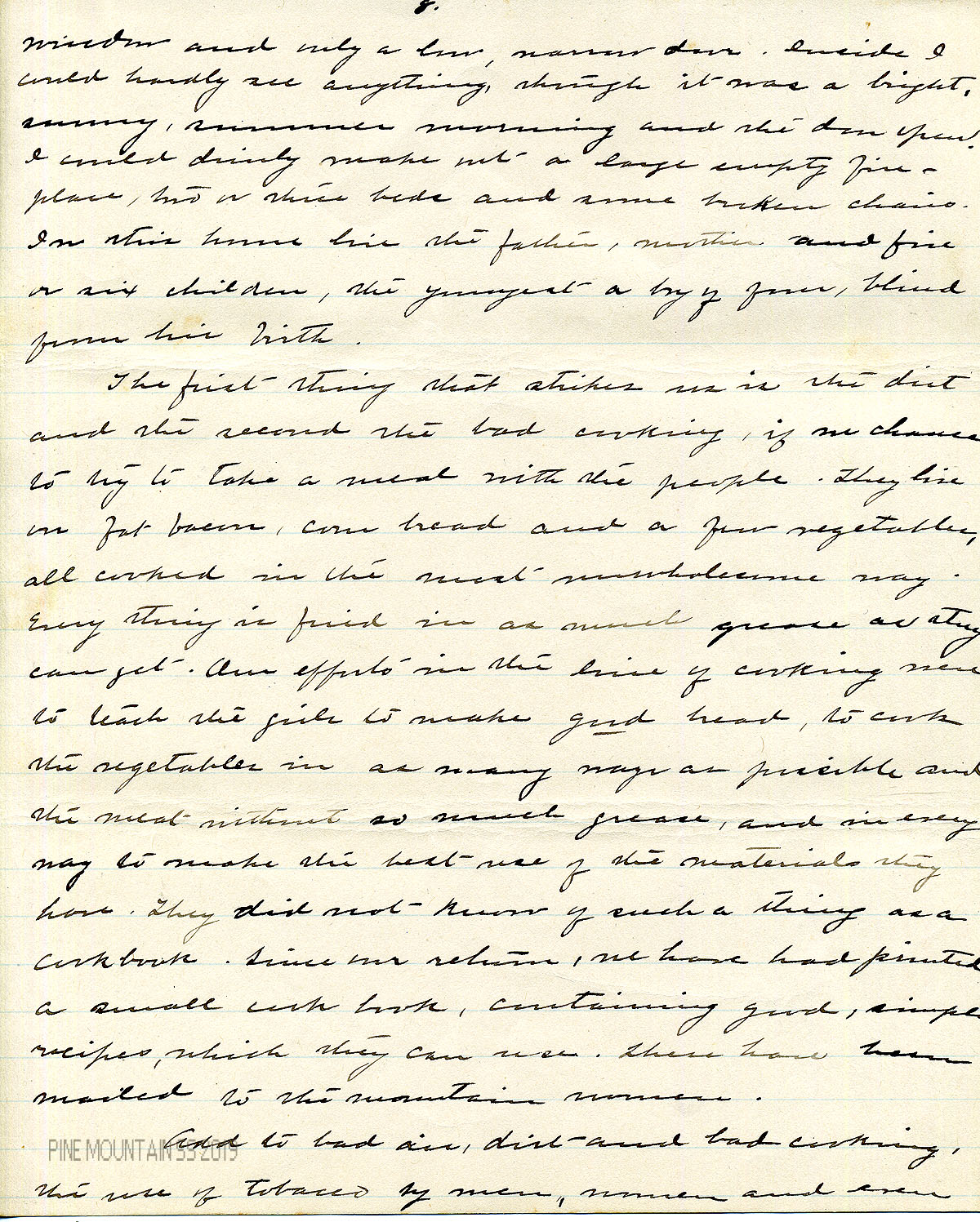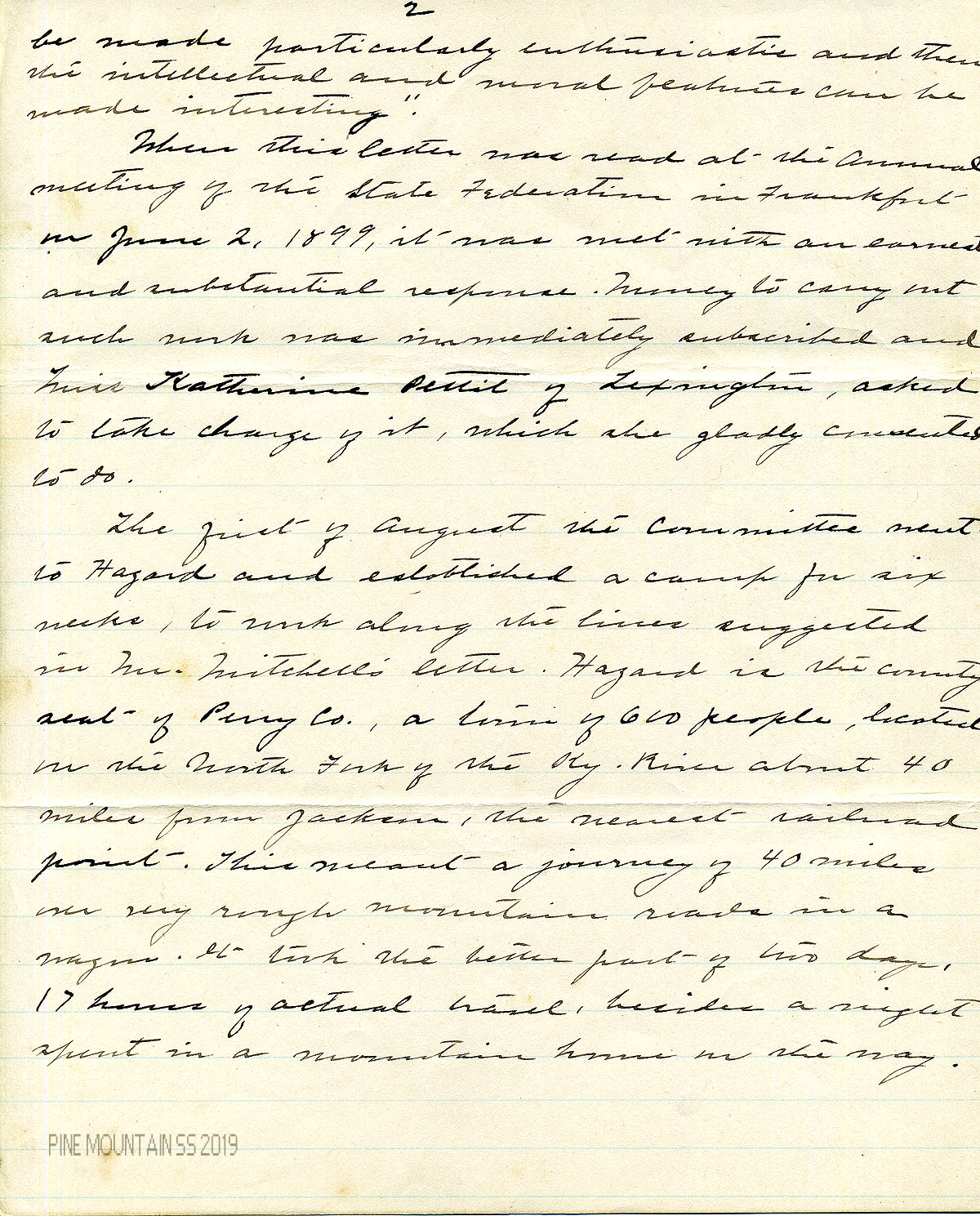 Although the author is not designated, the handwritten document resembles the script of Katherine Pettit. However, the handwriting is far more compact than her later scrawl and Pettit may not have penned the document. While preparing for his dissertation about Pine Mountain, Dr. James Greene III inspected the report and noted that it was “for the most part identical with the typescript,” and that, “It was evidently read to the State Federation of Women’s Clubs in late 1899 or early 1900.”