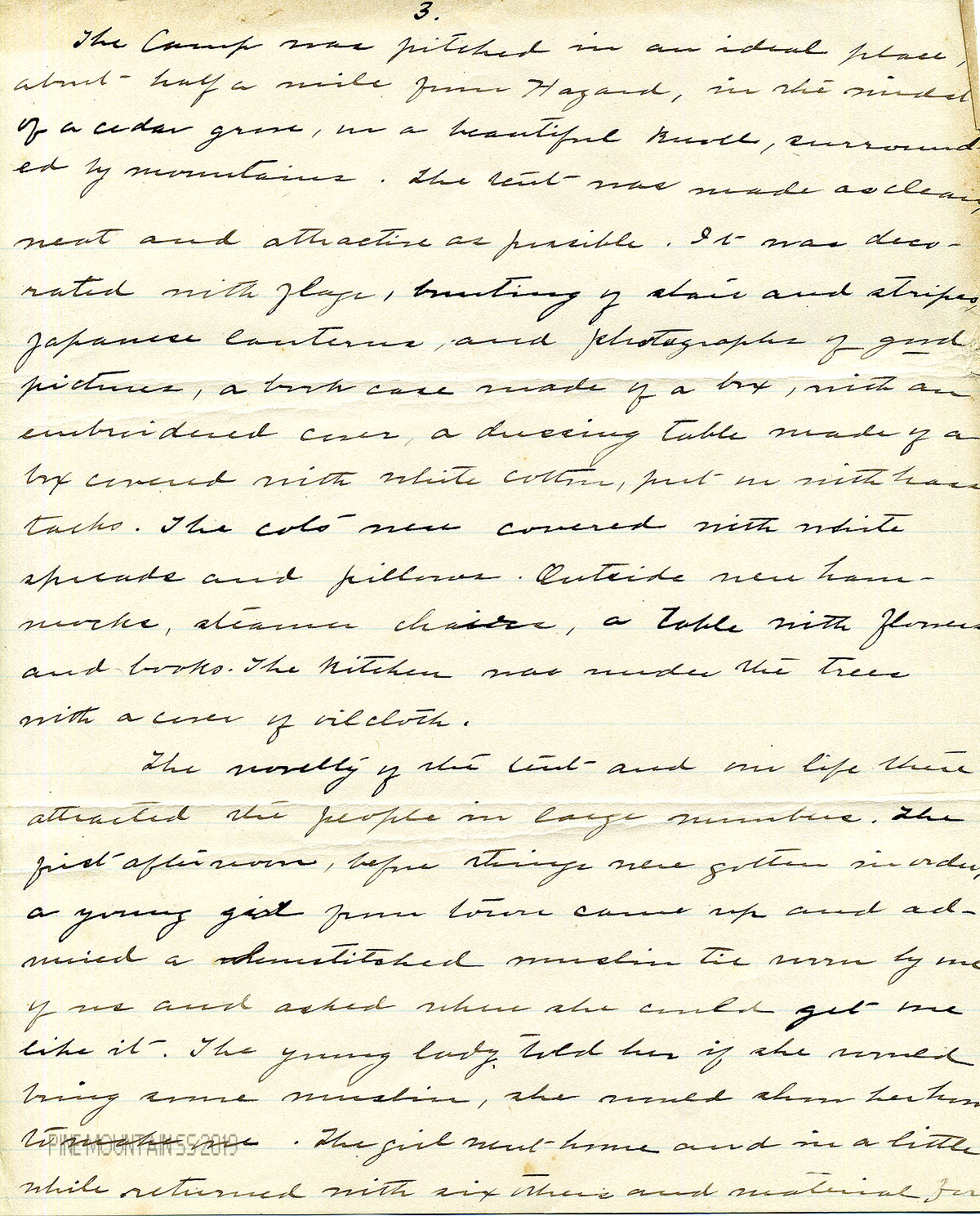 The Camp was pitched in an ideal place, about half a mile from Hazard, in the midst of a cedar grove on a beautiful knoll, surrounded by mountains. The tent was made as clean, neat and attractive as possible. It was decorated with flags, bunting of stars and stripes, Japanese lanterns and pictures. A book-case was made of a box, covered with an embroidered cover, a dressing table of a box, covered with white cotton, put on with brass tacks. The cots were covered with white spreads and pillows, Outside were hammocks, steamer chairs, and a table with flowers and books. The kitchen was under the trees with a cover of oilcloth.