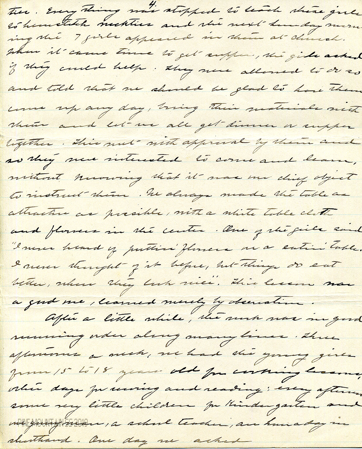 the seven girls appeared at church, wearing the neckties. When it came time to get supper, they asked if they could help. They were allowed to do so and told that we should be glad to have them come up any day, bring their materials with them and let us all get dinner or supper together. This met with approval by them and so they were interested to come and learn, without knowing that it was our chief object to instruct them. We always made the table as attractive as possible with a white table-cloth and flowers in the center, One of the girls said: “I never heard of puttin’ flowers on a eatin’ table. I never thought of it before, but things do eat better when they look nice.”