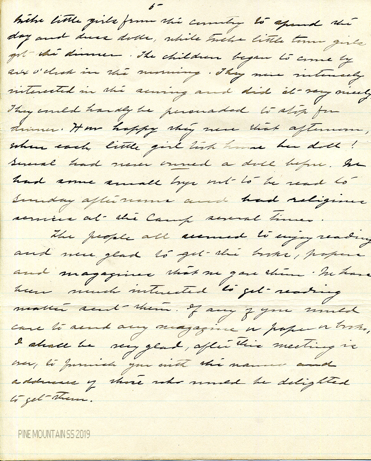 each little girl took home her doll! Several had never owned a doll before. We had some small boys out to read to Sunday afternoons, and had religious services at the Camp several times.