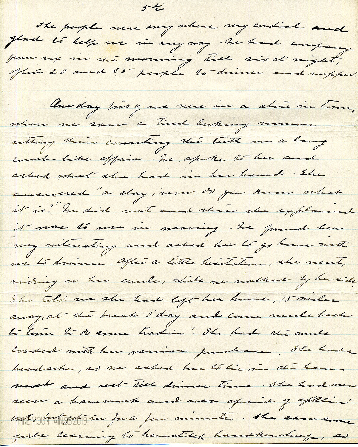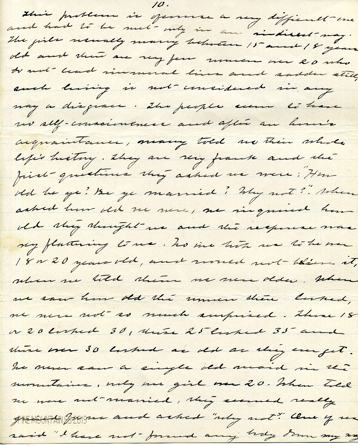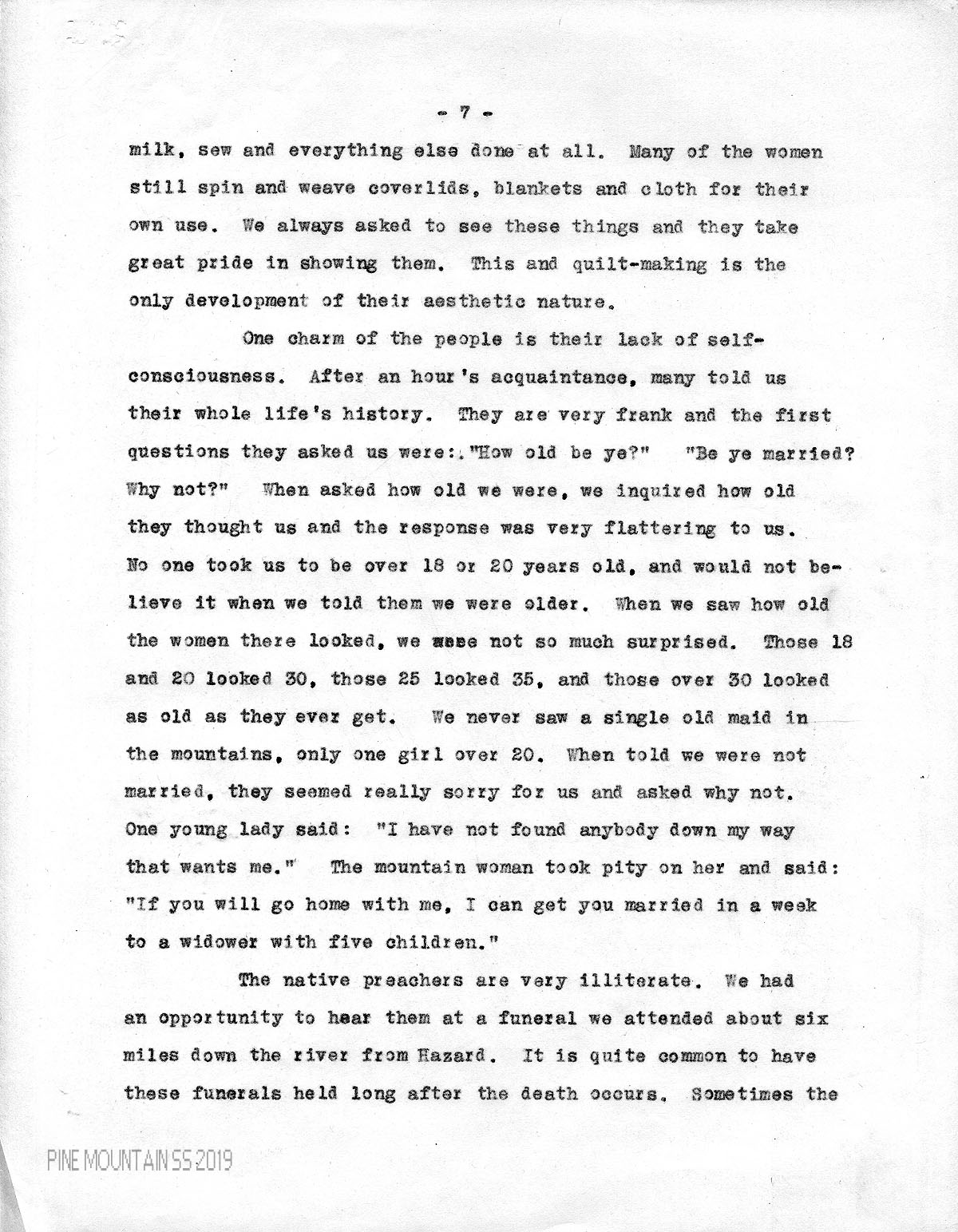 One charm of the people is their lack of self-consciousness. After an hour’s acquaintance, many told us their whole life’s history. They are very frank and the first questions they asked us were: “How old be ye?” “Be ye married? Why not?” When asked how old we were, we inquired how old they thought us and the response was very flattering to us. No one took us to be over 18 or 20 years old, and would not believe it when we told them we were older. When we saw how old the women there looked, we were not so much surprised. Those 18 and 20 looked 30, those 25 looked 35, and those over 30 looked as old as they ever get. We never saw a single old maid in the mountains, only one girl over 20. When told we were not married, they seemed really sorry for us and asked why not. One young lady said: “I have not found anybody down my way that wants me.” The mountain woman took pity on her and said: “If you will go home with me, I can get you married in a week to a widower with five children.”