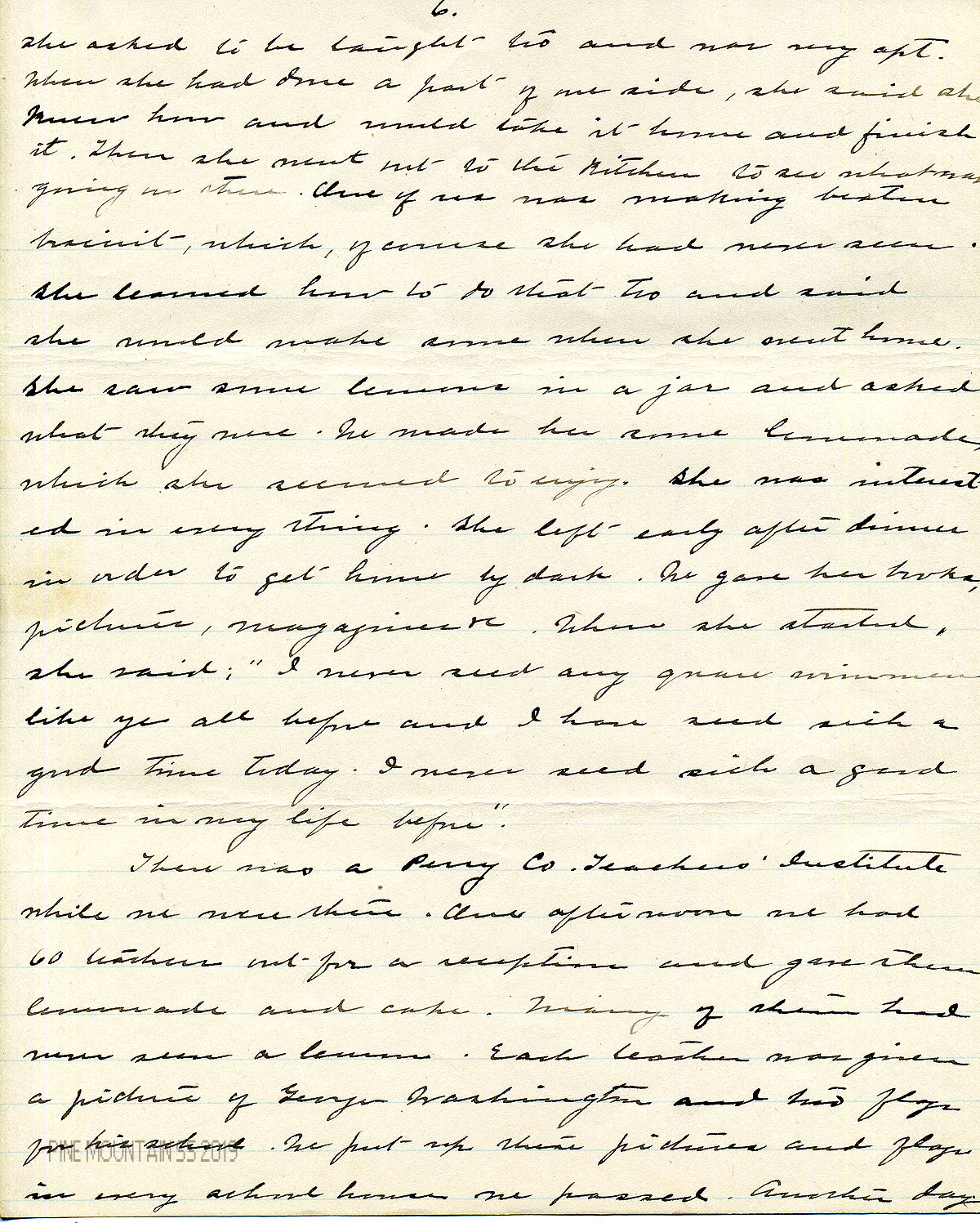 There was a Perry County Teachers’ Institute while we were there. One afternoon we had about 60 teachers out for a reception and gave them lemonade and cake. Many of them had never seen a lemon. Each teacher was given a picture of George Washington and two flags for his school-room. We put up pictures and flags in every school house we passed. Another day we had about 20 district teachers to lunch.
