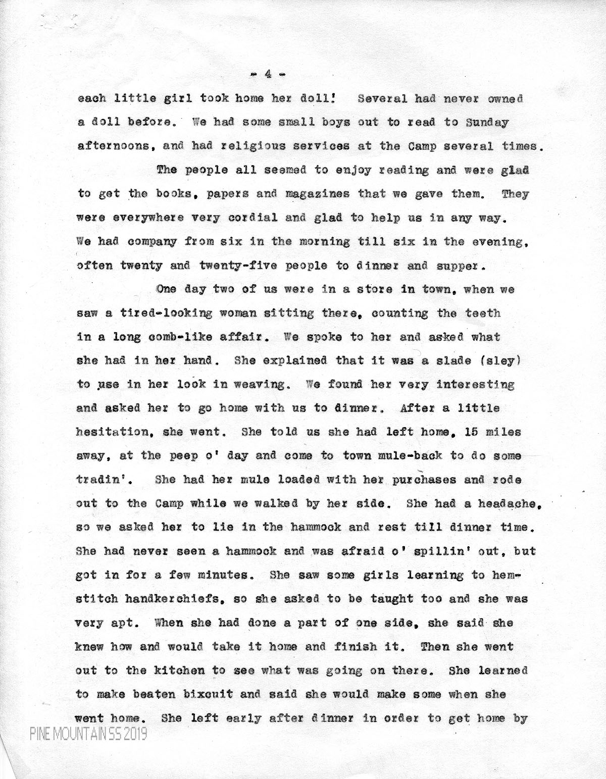 One day two of us were in a store in town, when we saw a tired-looking woman sitting there, counting the teeth in a long comb-like affair. We spoke to her and asked what she had in her hand. She explained that it was a slade (sley) to use in her loom in weaving. We found her very interesting and asked her to go home with us to dinner. After a little hesitation, she went. She told us she had left home, 15 miles away, at the peep o’ day and come to town mule-back to do some tradin’. She had her mule loaded with her purchases and rode out to the Camp while we walked by her side. She had a headache, so we asked her to lie in the hammock and rest till dinner time. She had never seen a hammock and was afraid o’ spillin’ out, but got in for a few minutes. She saw some girls learning to hemstitch handkerchiefs, so she asked to be taught too and she was very apt. When she had done a part of one side, she said she knew how and would take it home and finish it. Then she went out to the kitchen to see what was going on there. She learned to make beaten biscuit and said she would make some when she went home. She left early after dinner in order to get home by