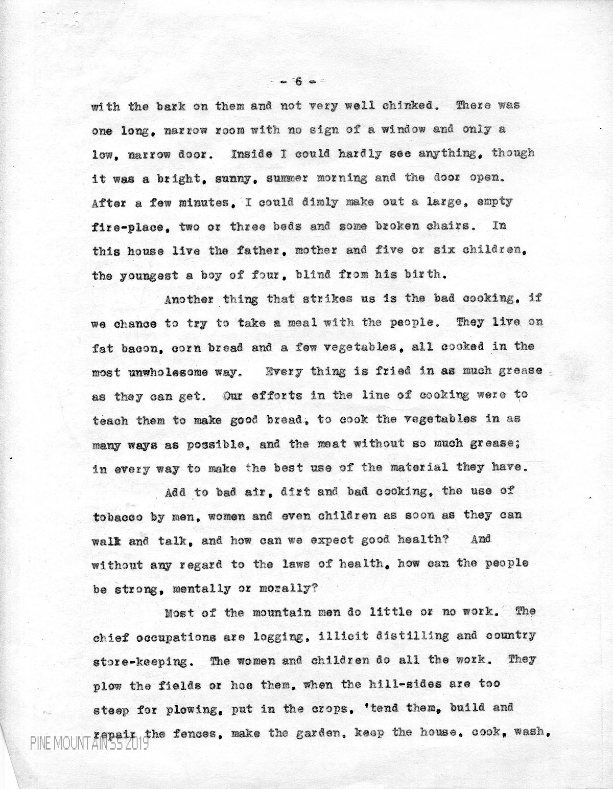 Most of the mountain men do little or no work. The chief occupations are logging, illicit distilling and country store-keeping. The women and children do all the work. They plow the fields or hoe them, when the hill-sides are too steep for plowing. put in the crops, ‘tend them, build and repair the fences, make the garden, keep the house, cook, wash,