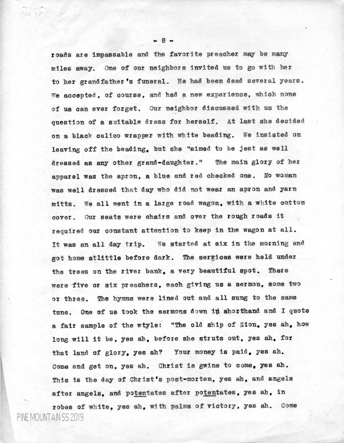 roads are impassable and the favorite preacher may be many miles away. One of our neighbors invited us to go with her to her grandfather’s funeral. He had been dead several years. We accepted, of course, and had a new experience, which none of us can ever forget. Our neighbor discussed with us the question of a suitable dress for herself. At last she decided on a black calico wrapper with white beading. We insisted on leaving off the beading. but she “aimed to be jest as well dressed as any other grand-daughter.” the main glory of her apparel was the apron, a blue and red checked one. No woman was well dressed that day who did not wear an apron and yarn mitts. We all went in a large road wagon, with a white cotton cover. Our seats were chairs and over the rough roads it required our constant attention to keep in the wagon at all. It was an all day trip. We started at six in the morning and got home at little before dark. The services were held under the trees on the river bank, a very beautiful spot. There were five or six preachers, each giving us a sermon, some two or three. The hymns were lined out and all sung to the same tune. One of us took the sermons down in shorthand and I quote a fair sample of the style: