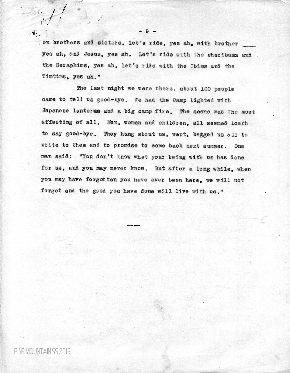 The last night we were there, about 100 people came to tell us good-bye. We had the Camp lighted with Japanese lanterns and a big camp fire. The scene was the most affecting of all. Men, women and children, all seemed loath to say good-bye. They hung about us, wept, begged us all to write to them and to promise to come back next summer. One man said: “You don’t know what your being with us has done for us, and you may never know. But after a long while, when you may have forgotten you have ever been here, we will not forget and the good you have done will live with us.”