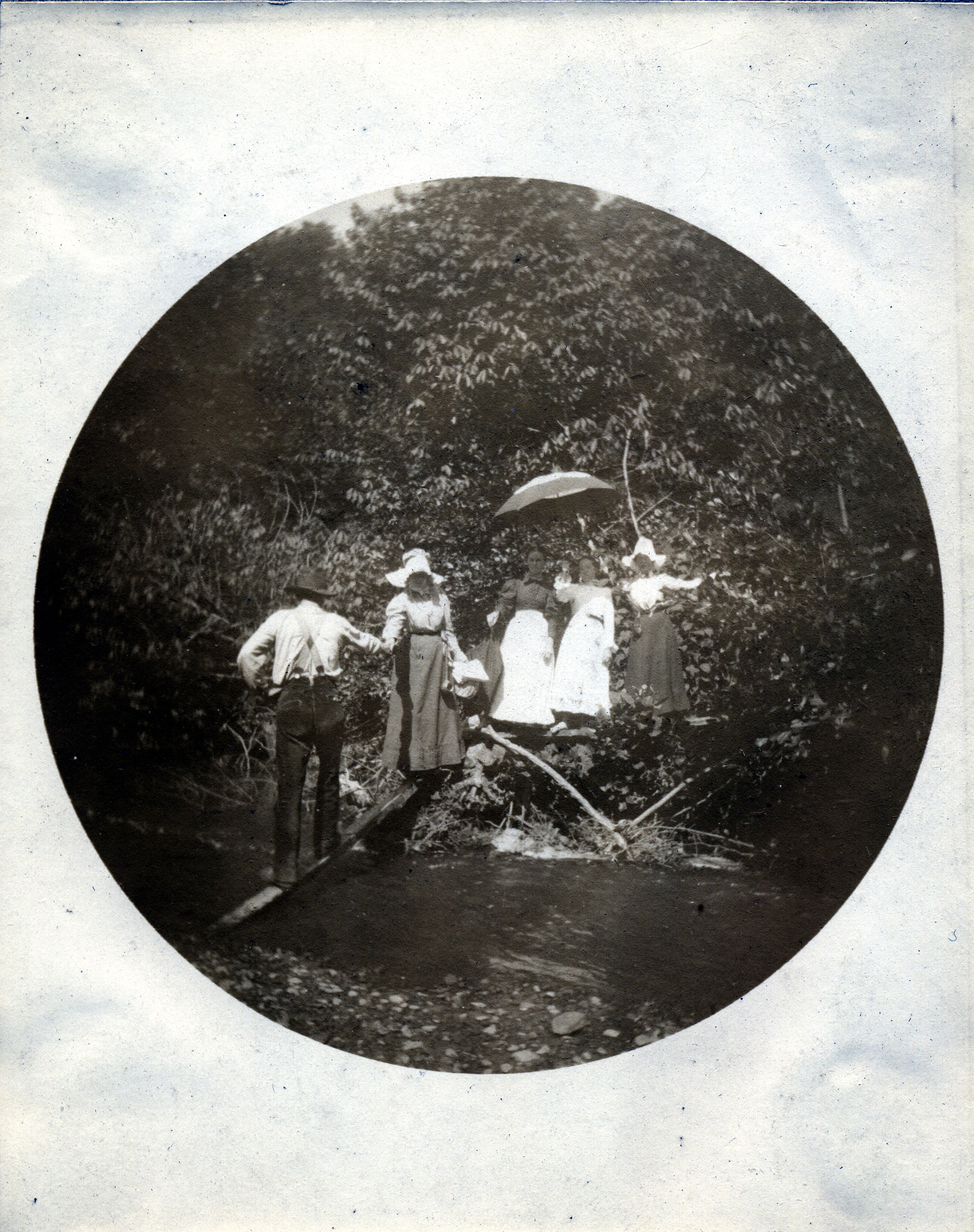- Walking a foot log at summer camp, Sassafras, KY, 1901. Katherine Pettit Sassafras Album. [sas_004.jpg]