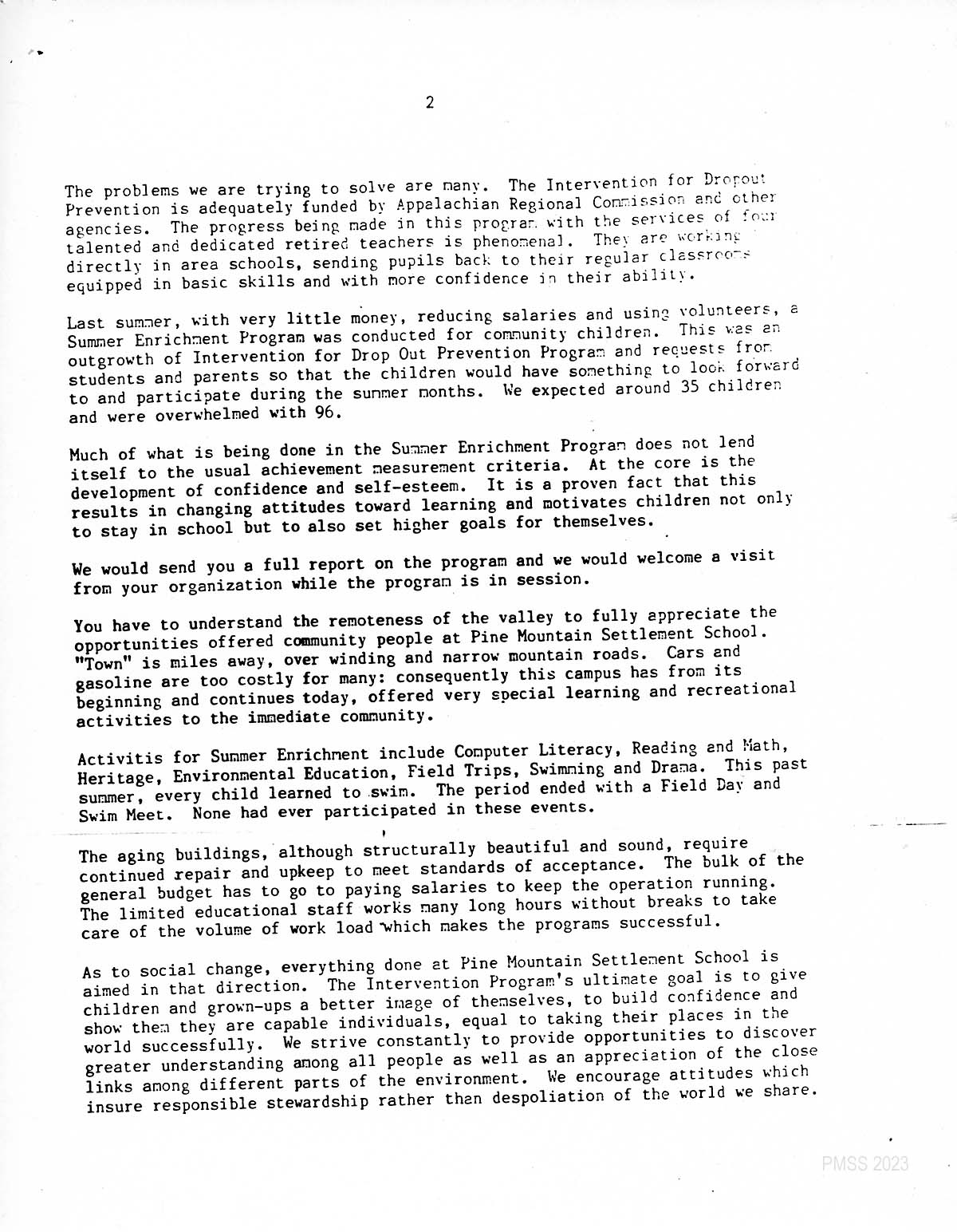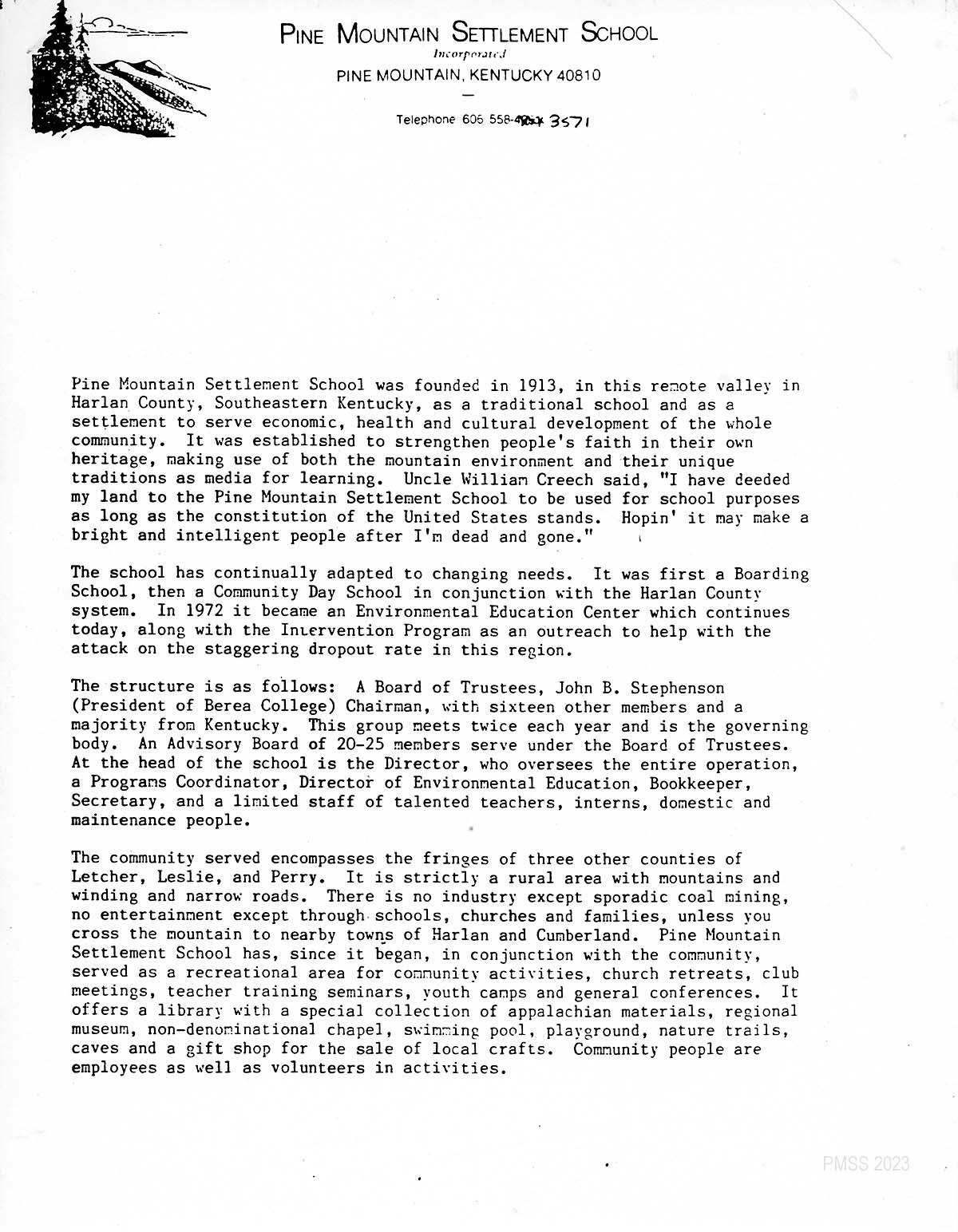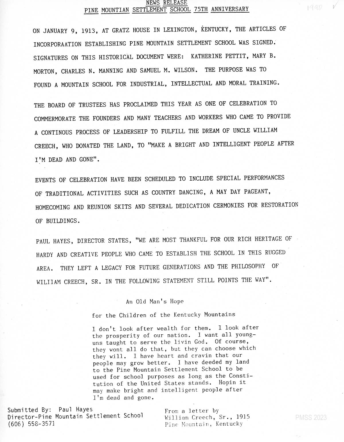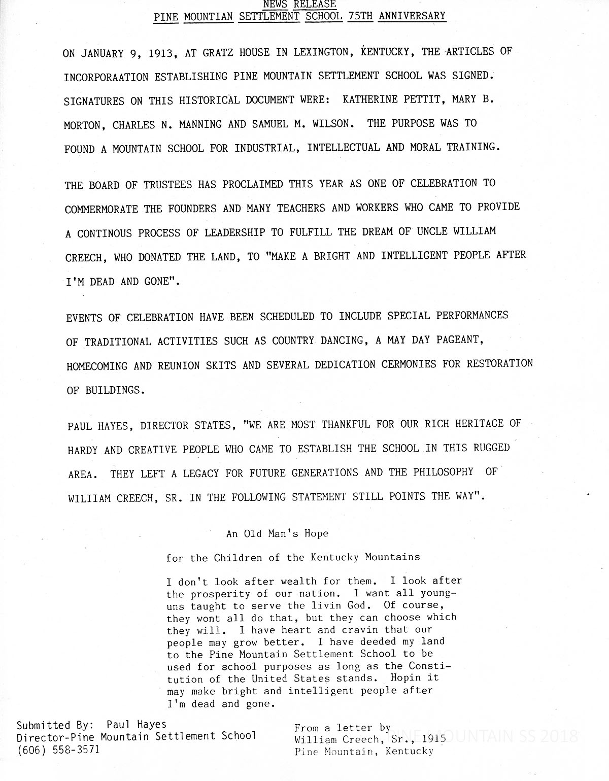 On the occasion of the 75th Anniversary of Pine Mountain Settlement School in 1988, Director Paul Hayes drafted the following news release: