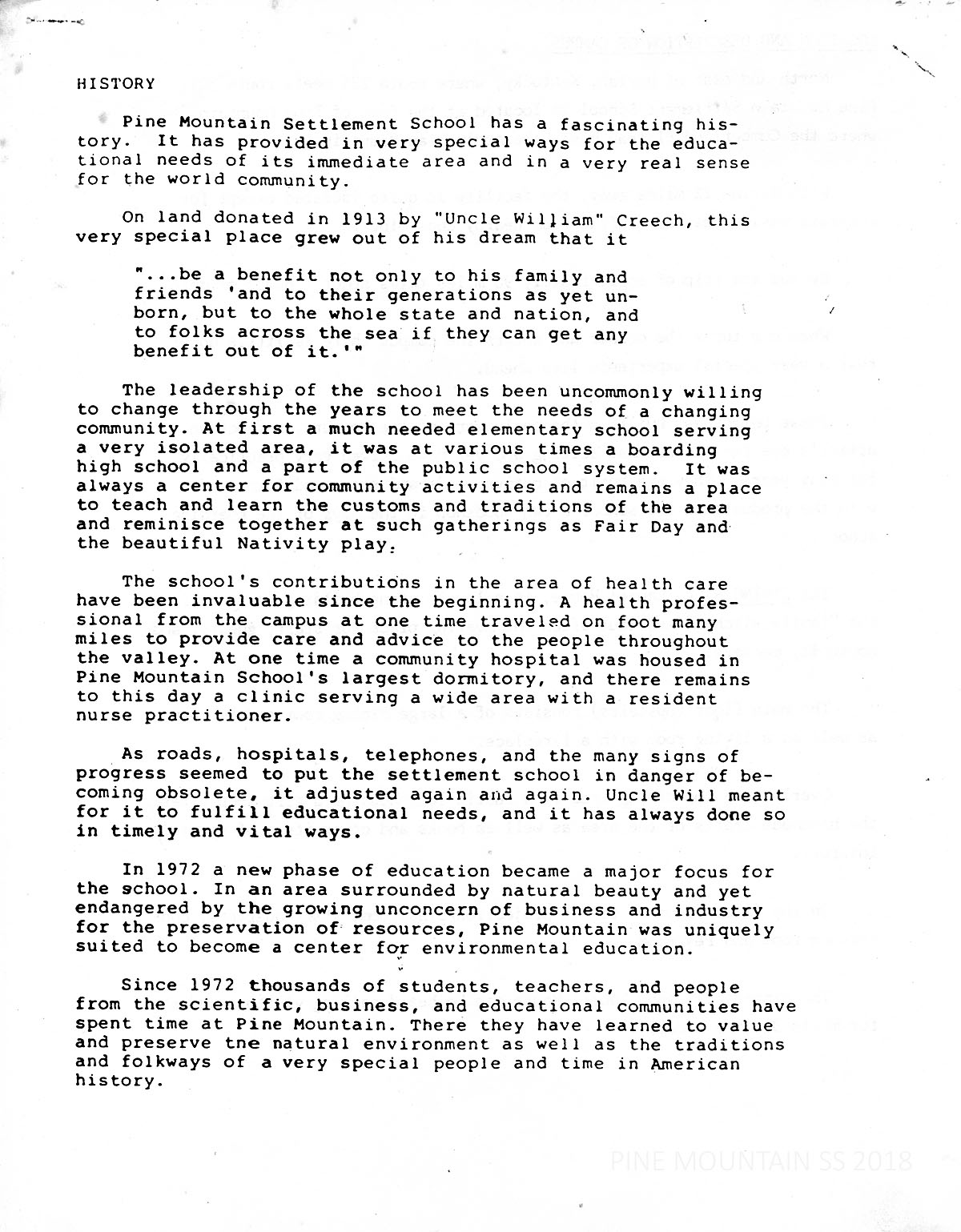 Pine Mountain Settlement School has a fascinating history. It has provided in very special ways for the educational needs of its immediate area and in a very real sense for the world community.
