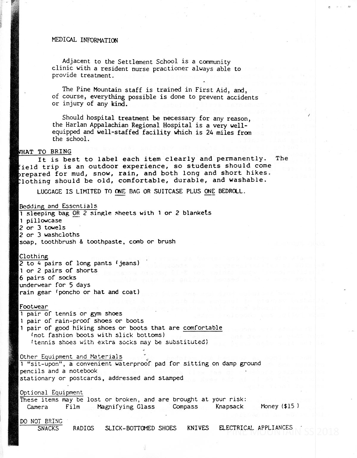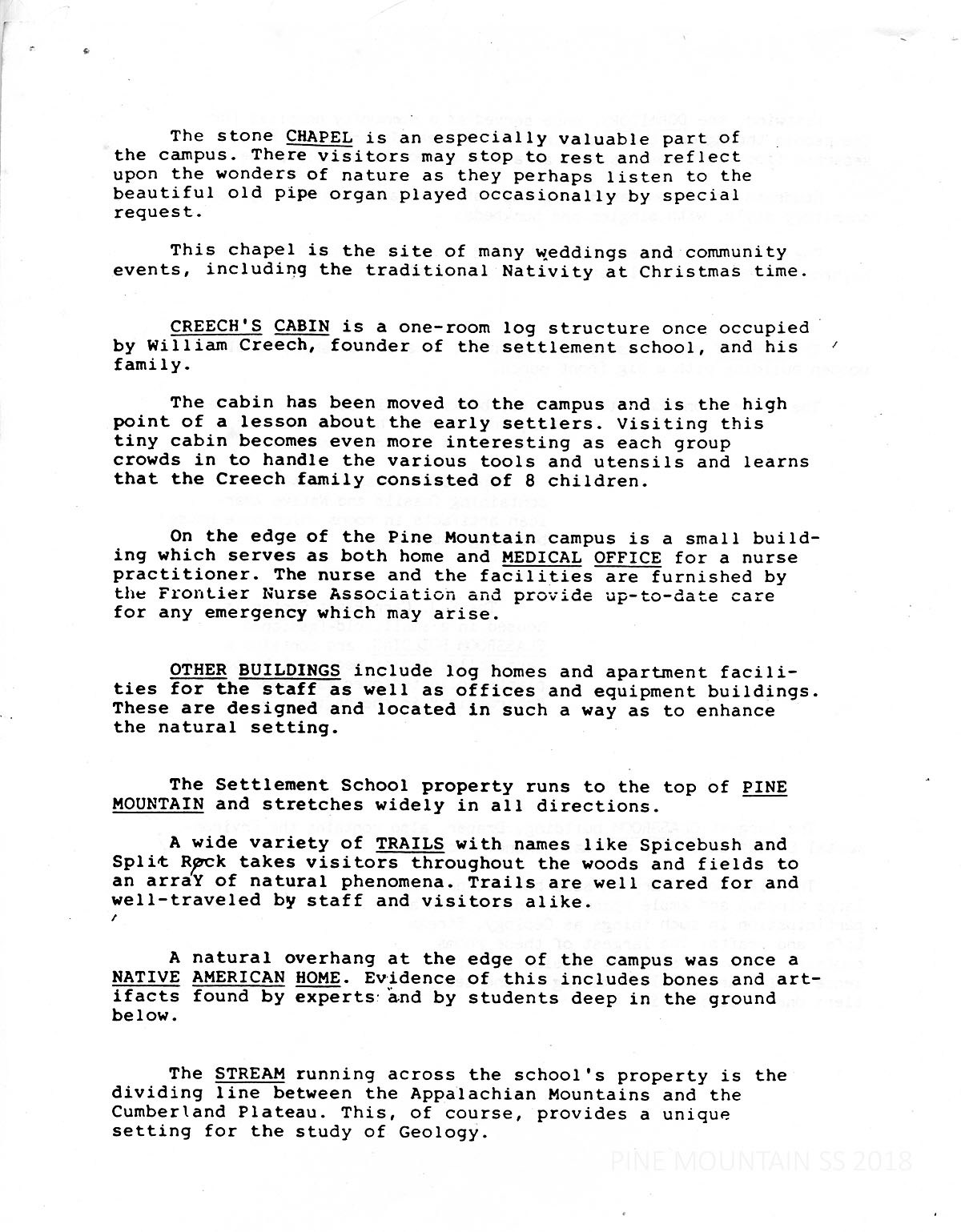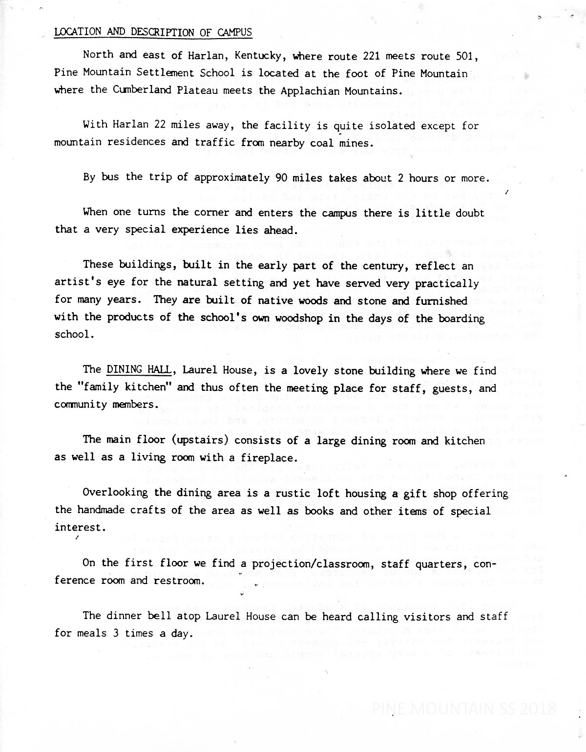 TAGS: 75th Anniversary of PMSS founding, Paul Hayes, PMSS history, William Creech, Articles of Incorporation, West Wind visitor policies, visitor guide, Environmental Education, EE Programming, built environment, student orientation, Pine Mountain Settlement School, Harlan County KY