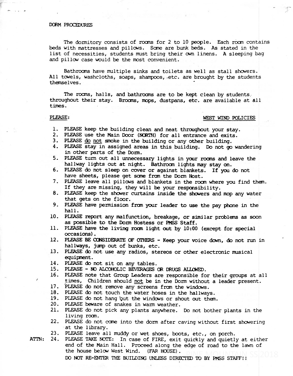 24. ATTN: PLEASE TAKE NOTE: In case of FIRE, exit quickly and quietly at either end of the Main Hall. Proceed along the edge of the road to the lawn of the house below West Wind. (FAR HOUSE)