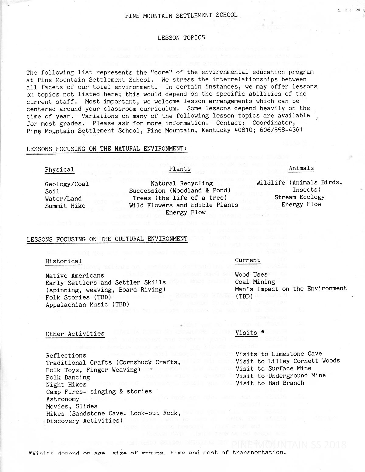 PINE MOUNTAIN SETTLEMENT SCHOOL LESSON TOPICS