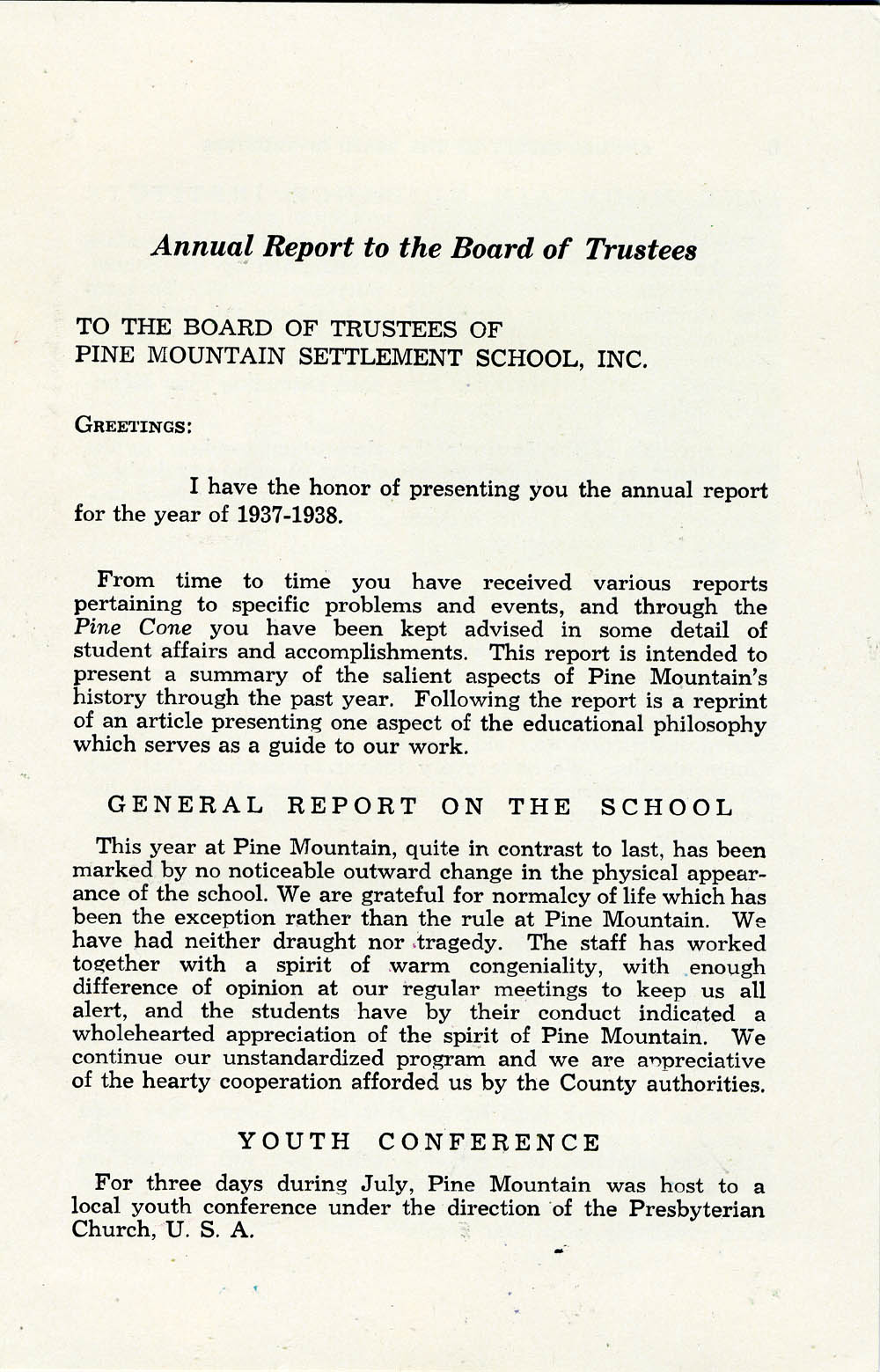 TAGS: Governance, director’s annual reports to BOT 1937-1938, Glyn Morris, John A. Spelman III woodcuts, Youth Guidance Institute, pack horse library service, Infirmary, White House dinner performance, PMSS calendar, farm and garden, principal’s report, Junior Enterprise, Line Fork Settlement, Medical Settlement Big Laurel, religious life, financial statement for 1936-37, guidance counselors, citizenship committee, student co-operative store, student community group, folk dancing, PMSS staff list, request for meeting with BOT
