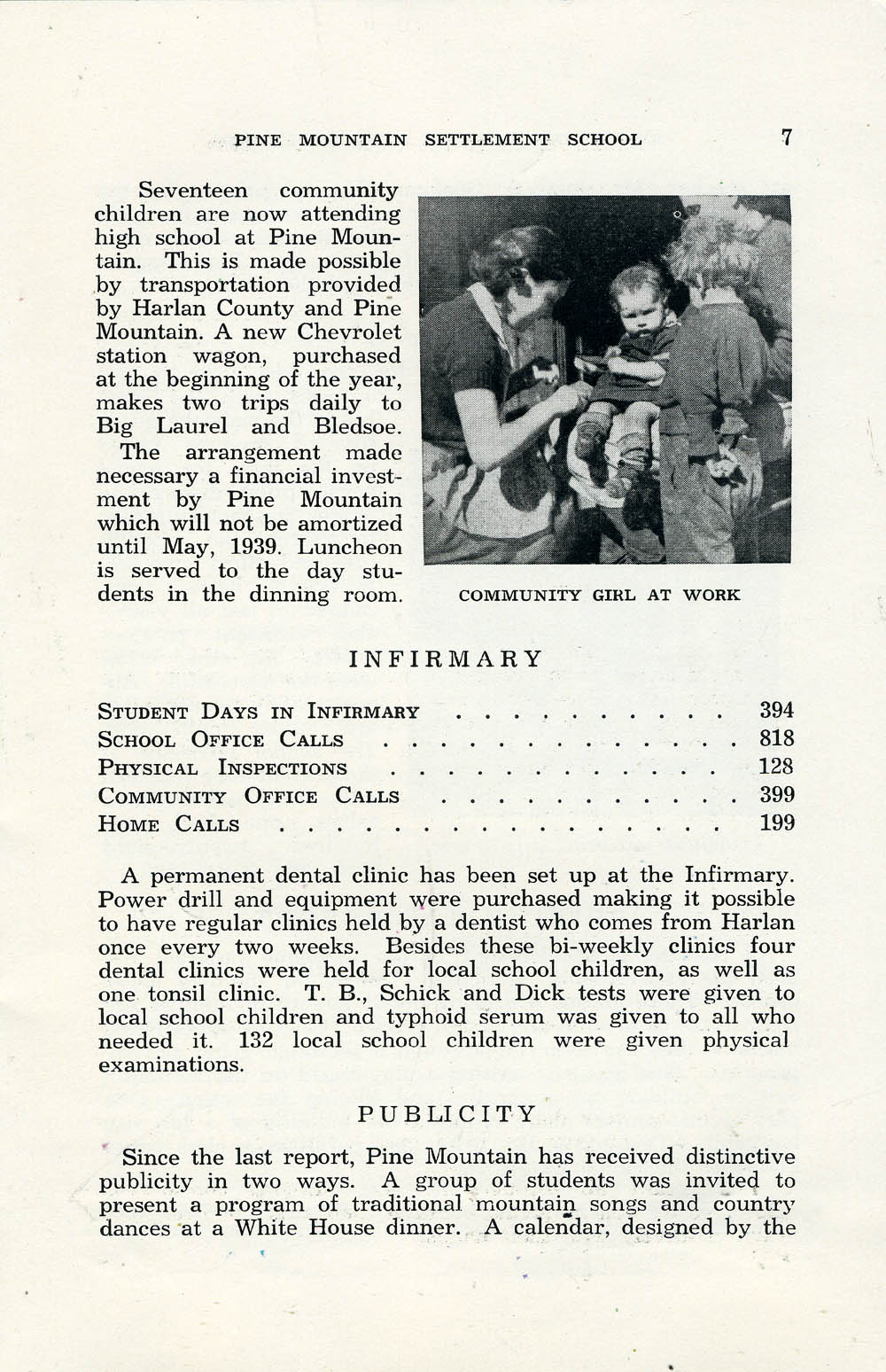 INFIRMARY: Statistics of student days in Infirmary, office calls, physical inspections, community office calls, and home calls; permanent dental clinic in Infirmary; TB, Schick, and Dick tests; typhoid serum; physical exams of local school children.