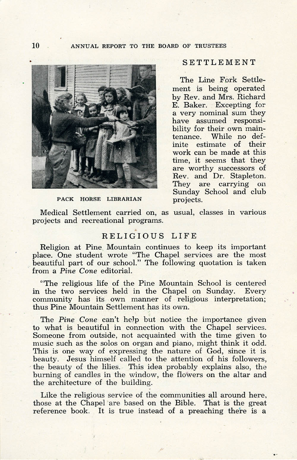 009 (Page 10) SETTLEMENT: Line Fork is operated by Rev. and Mrs. Richard E. Baker, successors of Rev. and Dr. Stapleton. Medical Settlement continues classes and recreational programs.