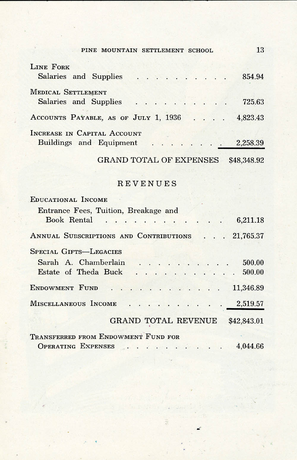 012 (Page 13) Financial Statement for 1936-37 [continued]: Lists of expenses for Line Fork, Medical Settlement; Accounts Payable, Increase in Capital Account, Revenues (educational income, annual subscriptions and contributions, special gifts – legacies, endowment fund, miscellaneous income; Amount transferred from Endowment fund for operation expenses.