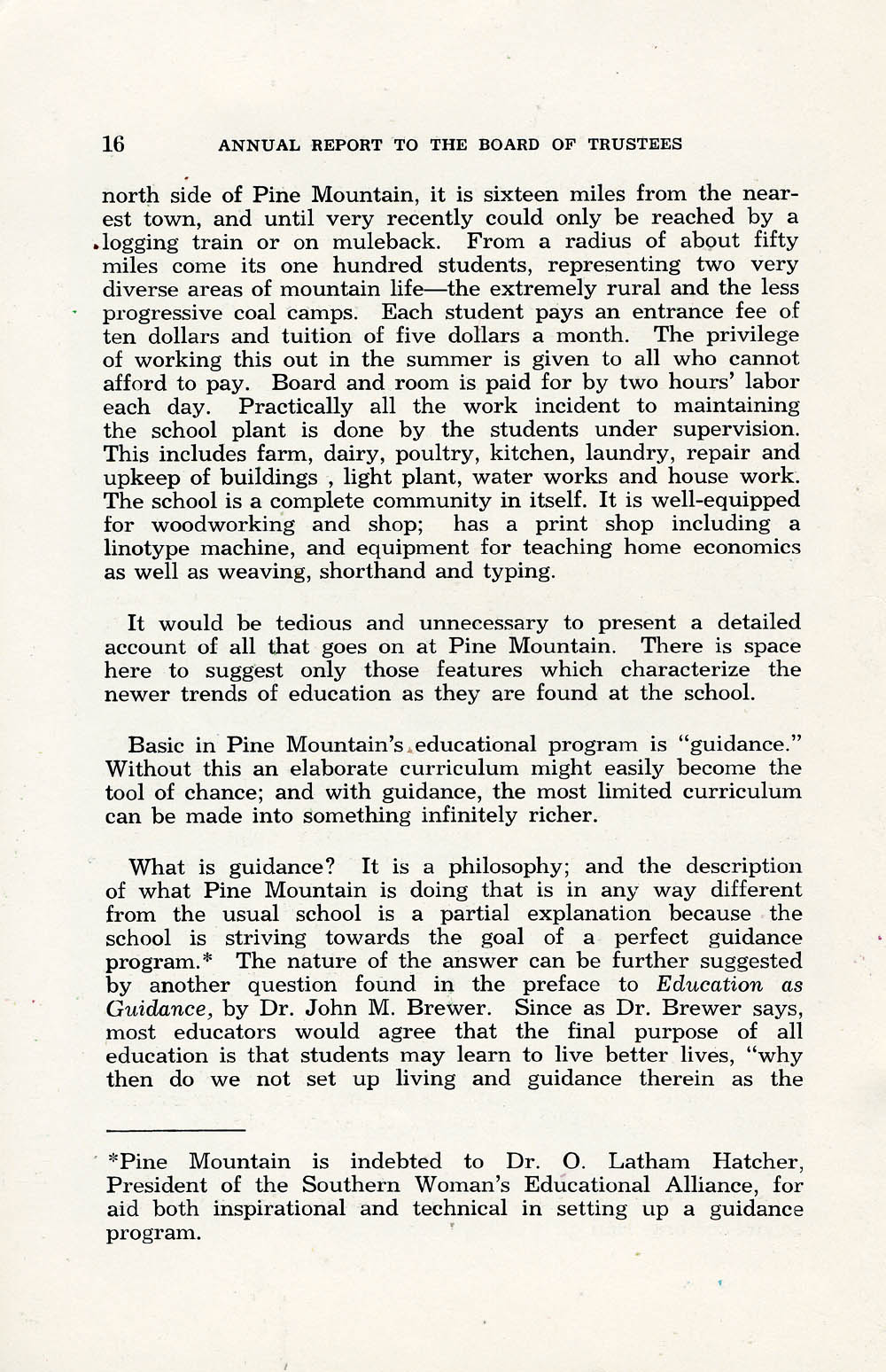 014 (Page 16) [Continued from page 15] Isolation of PMSS; student demographics; tuition; student labor; summer work; self-sufficiency of PMSS; educational equipment. ‘Basic in Pine Mountain’s educational program is ‘guidance.’” Definition of “Guidance”; appreciation for Dr. O. Latham Hatcher, “President of the Southern Woman’s Educational Alliance, for aid both inspirational and technical in setting up a guidance program.” Reference to the preface to Education as Guidance by Dr. John M. Brewer (Macmillan and Co., NY. 1937.).