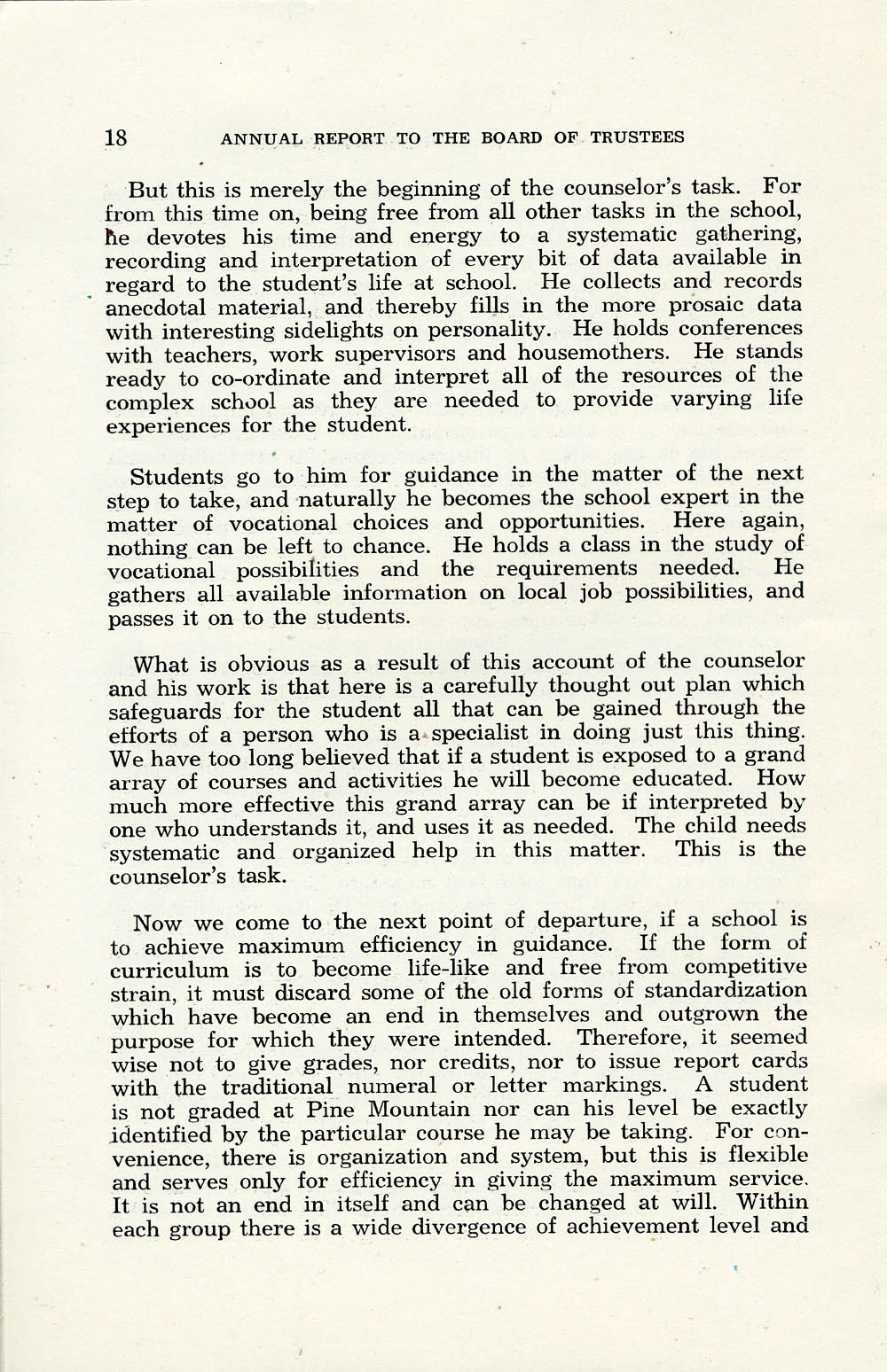 016 (Page 18) [Continued from page 17] Additional tasks of the counselor; “The child needs systematic and organized help” in interpreting and selecting from the array of courses and activities. The PMSS student is not graded and “old forms of standardization” are discarded, in order that the curriculum is “life-like and free from competitive strain.”