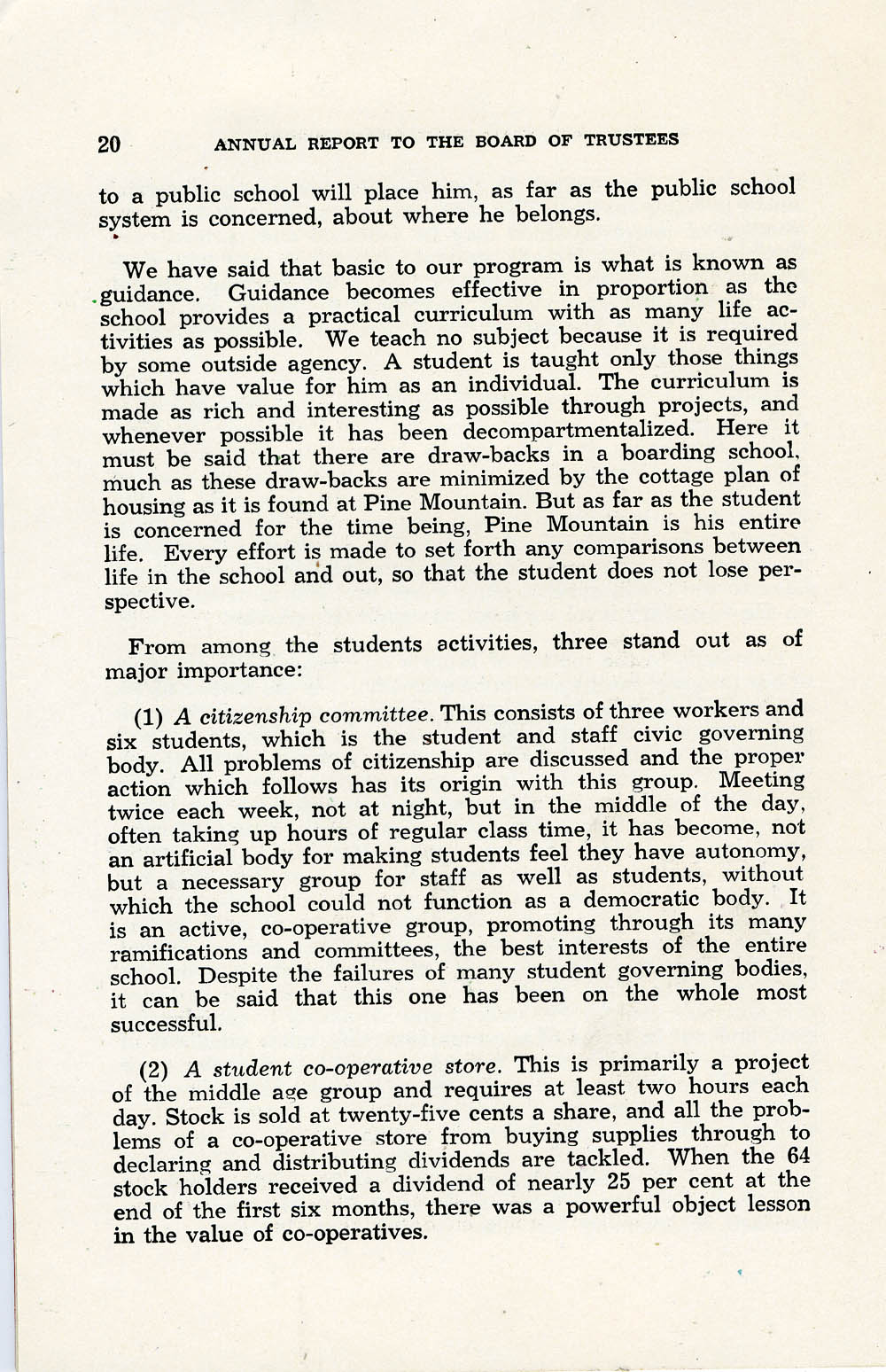 017 (Page 20) [Continued from page 19.] Curriculum of “life activities”; cottage plan of housing. Descriptions of three of the most important student activities: (1) A citizenship committee, (2) A student co-operative store, …