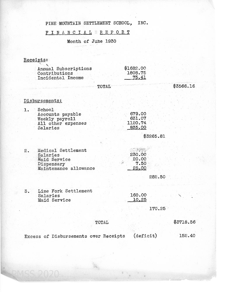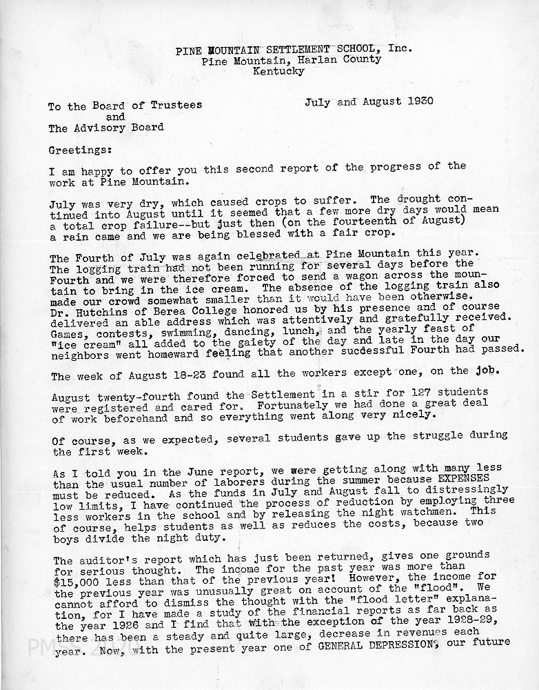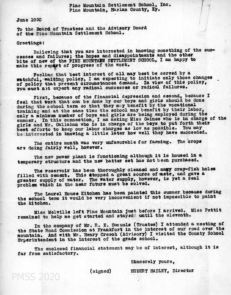June 001 June 1930. To the Board of Trustees and the Advisory Board from Hubert Hadley, Director, who is following a “watchful, waiting policy.” Therefore, he will “initiate only those changes of policy that present circumstances demand….” He asked Miss [Ruth B.] Gaines and Mr. [B.C.] Callahan, who are in charge of the students, to limit the amount of student labor in the summer, due to the “financial depression” and the need for students to get vocational training through work/study during the school term. Farming has gone “fairly well,” in spite of unfavorable weather. The new power plant is functioning but needs a “new batter set.” The reservoir has been cleaned and crayfish holes have been filled with cement. “The water supply, however, is yet a real problem….” Laurel House Kitchen has been painted. Miss [Angela] Melville left PMSS. Hadley and Mr. R.E. Samuels (Trustee) attended a meeting of the State Road Commission in Frankfort about the road over the mountain. Encloses a financial statement.