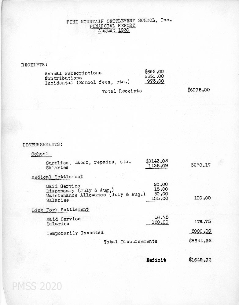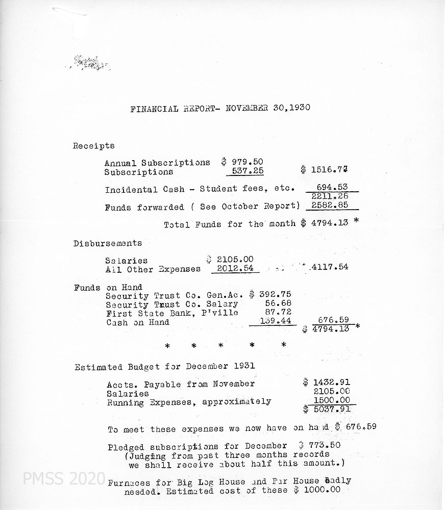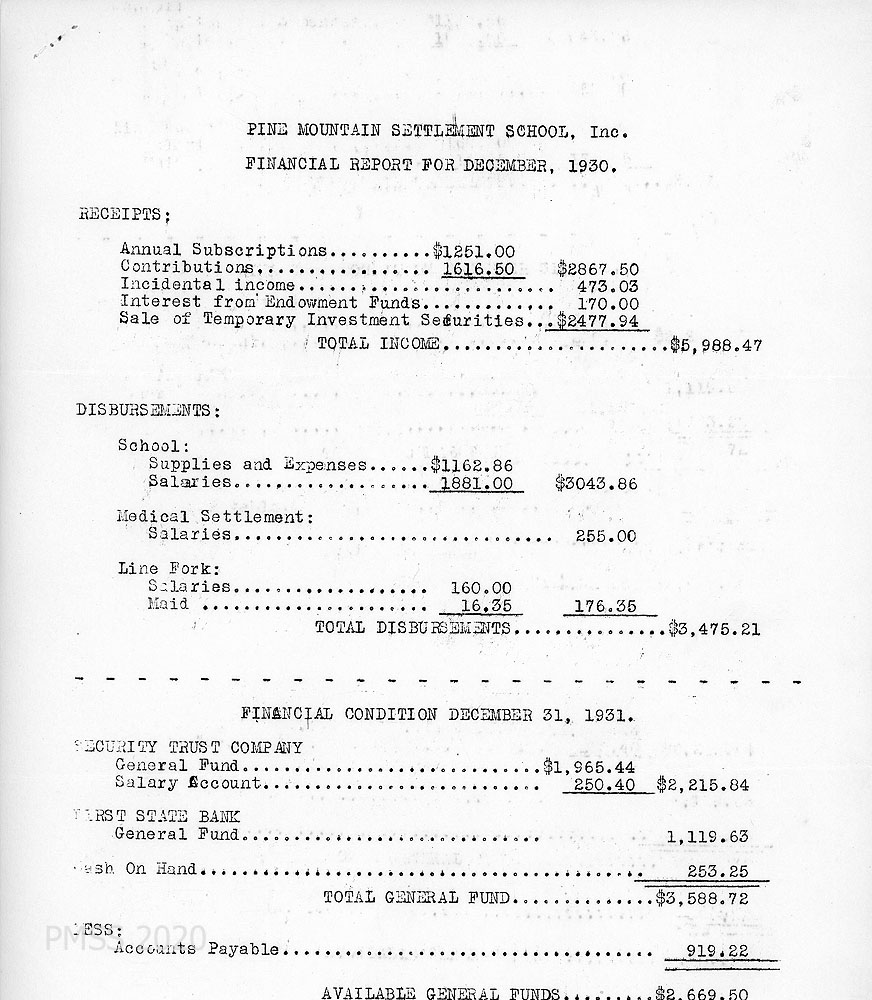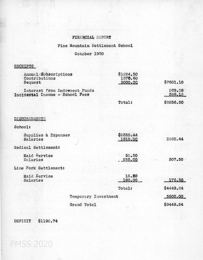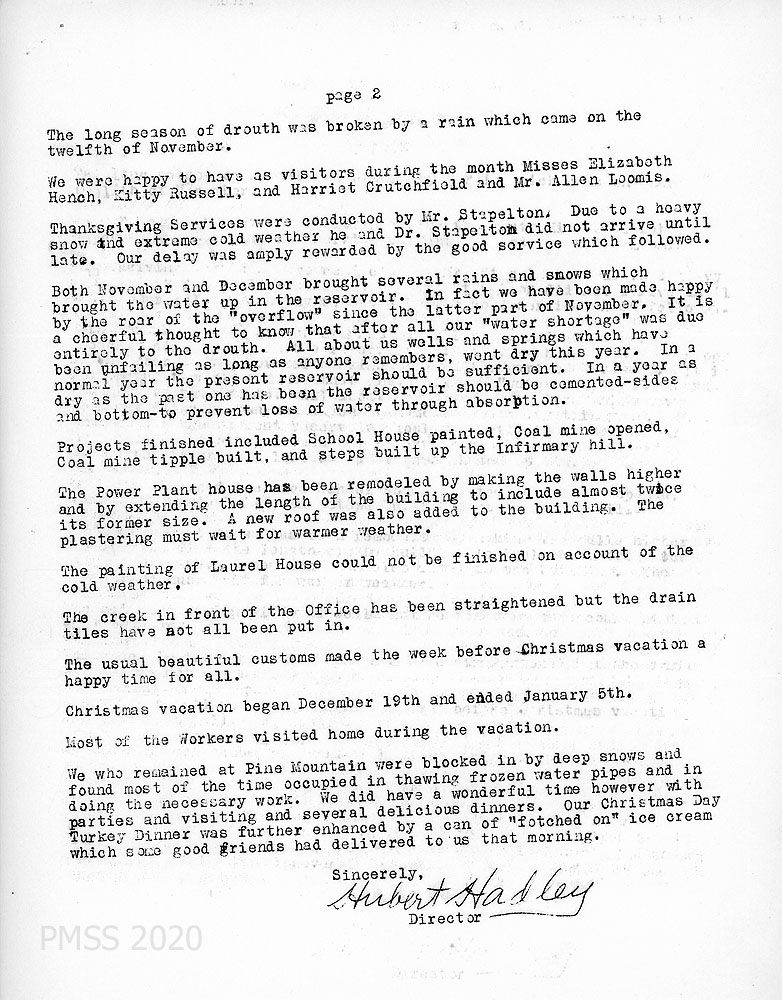 TAGS: Governance, 1930 Director’s annual reports to BOT, PMSS Board of Trustees, Director’s reports, financial reports, Hubert Hadley, student labor, farming, power plant housing, reservoir, the road over the mountain, eye exams, home-sickness, creek straightening, Fair Day, coal mine, farm and poultry departments, Little School, The Pine Mountain Ballads, Halloween, Thanksgiving, and Christmas celebrations, bequest, pianos, Community School, visitors