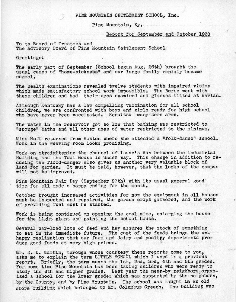 Sept 001 (Page 1) September and October 1930. Three-page report to Board of Trustees and the Advisory Board from Hubert Hadley, Director, concerning the following:  “the usual cases of ‘home-sickness’” in early September; twelve students had eyes examined and glasses fitted in Harlan; vaccinations; water was restricted due to low reservoir; Miss [Becky Mae] Huff returned from a Boston folk-dance school; straightening of Isaac’s Run to reduce flood danger and increase garden land; Pine Mountain Fair Day on September 27; preparations for winter; coal mine; enlarging light plant housing; painting school house; feed and hay deliveries – “The cost of the feeds brings the unhappy realization that our farm and dairy and poultry departments produce good foods at very high prices.”; Little School history and explanation;